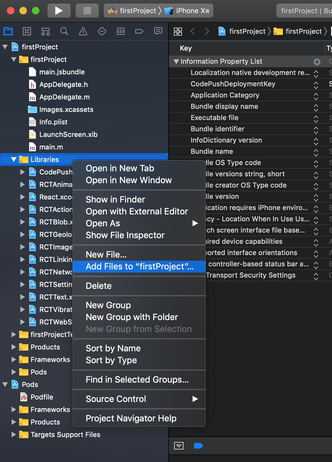 xCode에서 Libraries에서 마우스 오른쪽 클릭 > Add Files to <Project Name>