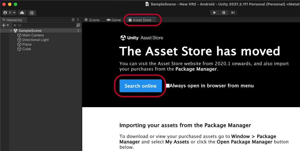 Window > Asset Store를 열어서 Search online 버튼을 누릅니다.