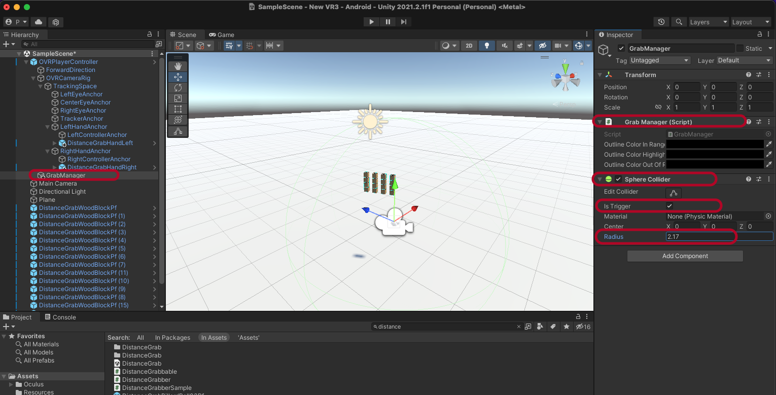 DistanceGrabHandLeft와 DistanceGrabHandRight에 콤포넌트가 다른것을 알 수 있습니다