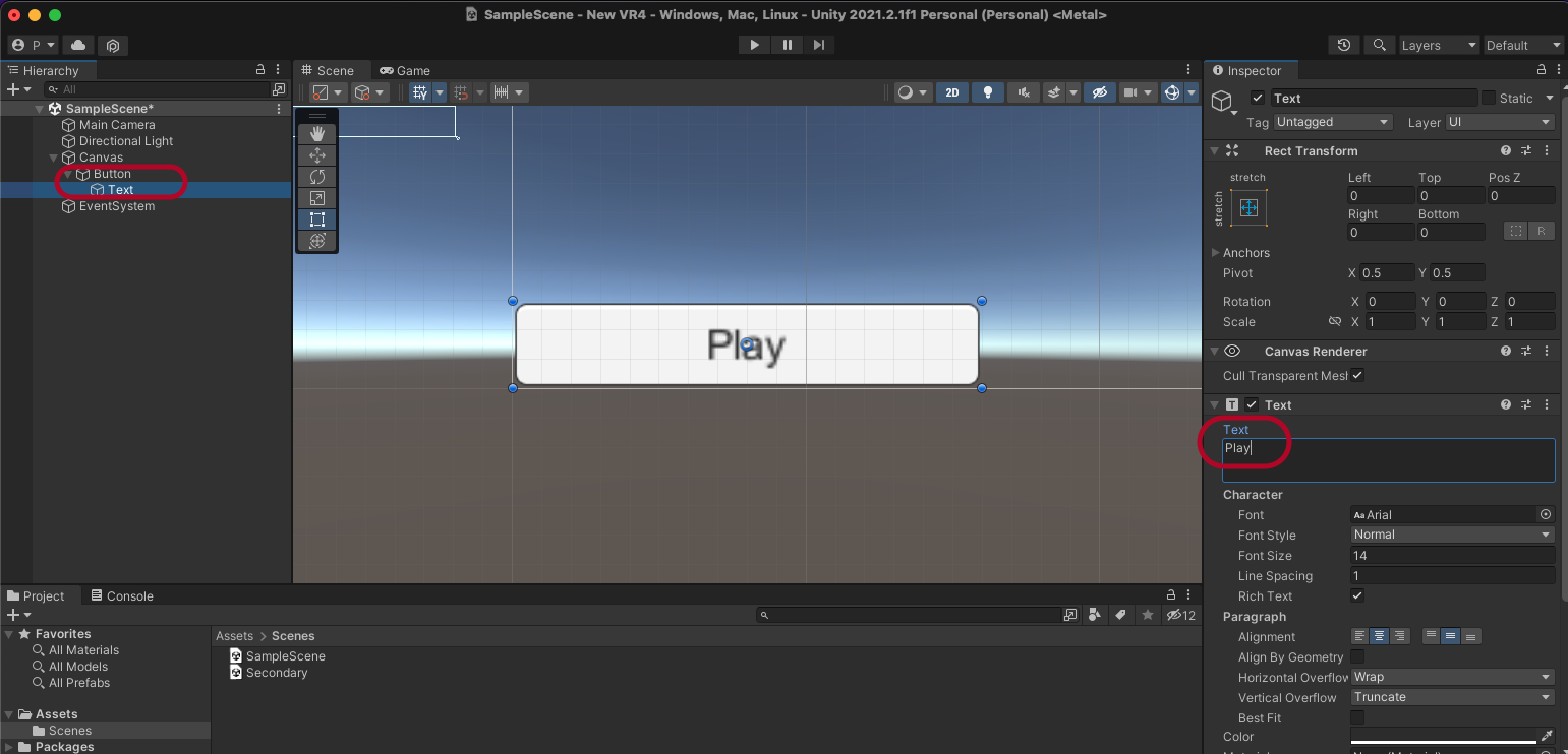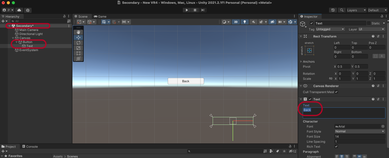 Secondary 씬에서 Button을 생성하고 Back으로 Text를 수정합니다.