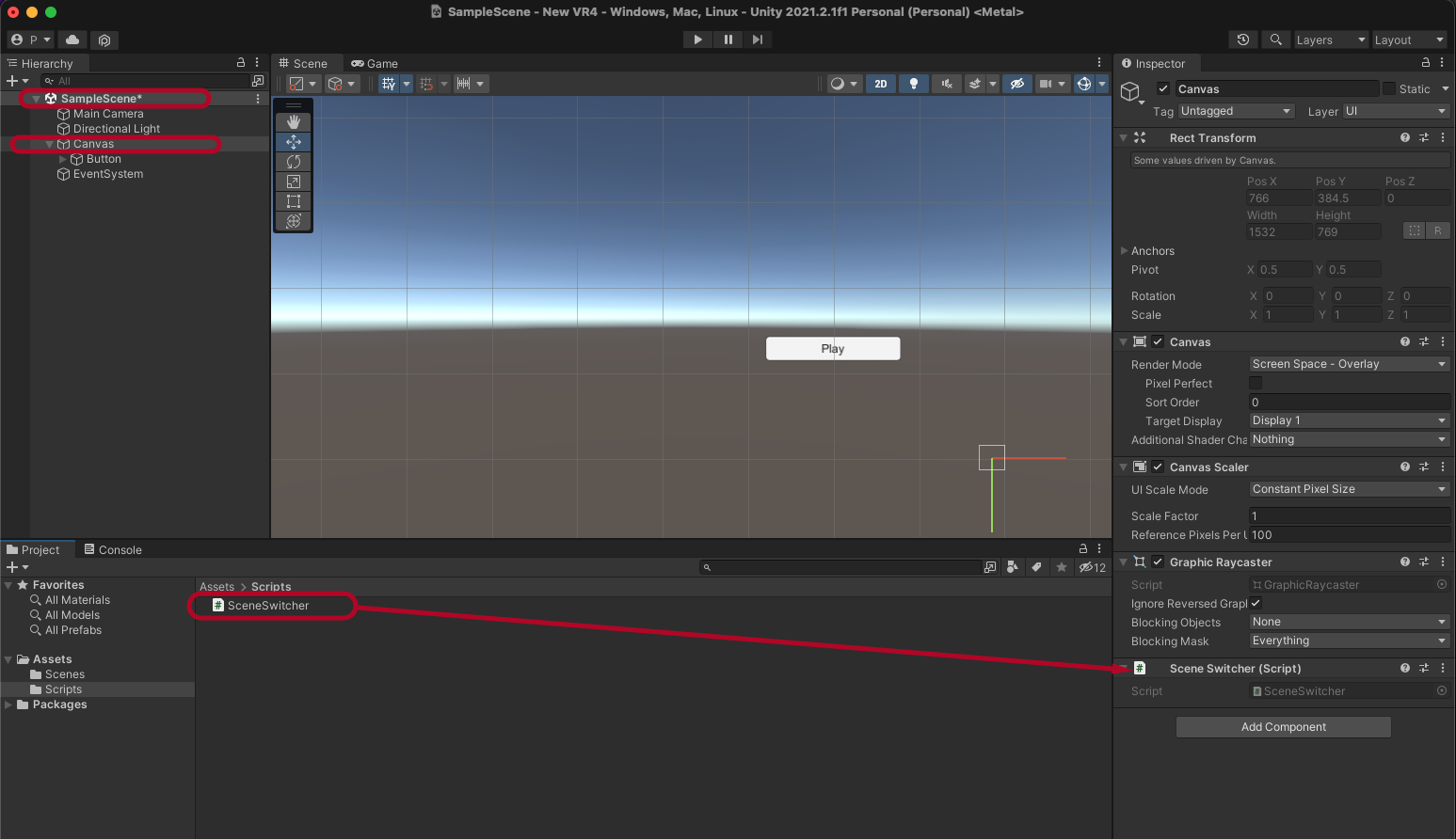 SampleScene으로 변환해서 Canvas를 선택하고 SceneSwitcher 스크립트 파일을 Component에 드래그 해서 넣어 줍니다.