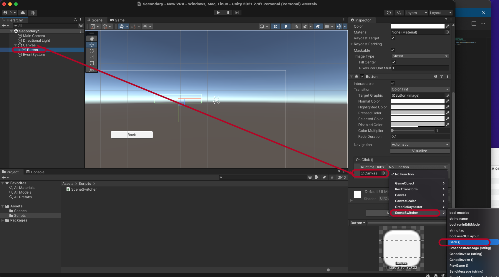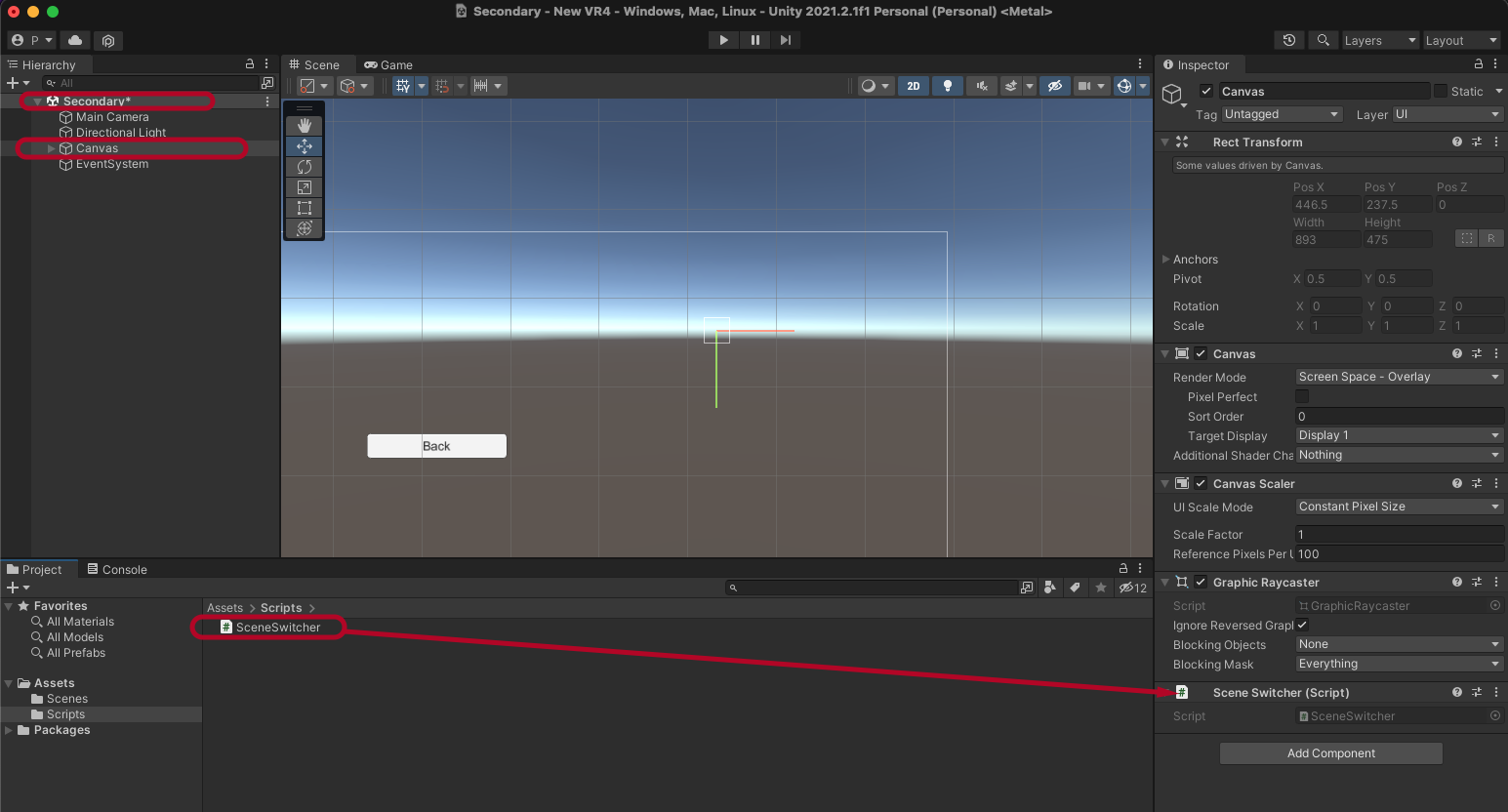 마찬가지로 Secondary 씬으로 전환해서 Cavas에 SceneSwitcher를 추가합니다.