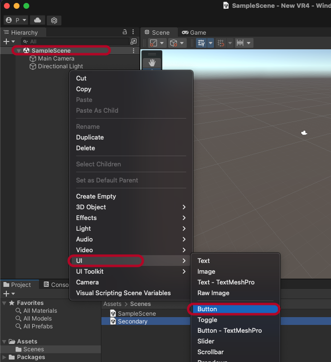 Create > Scene해서 이름을 Secondary로 변경합니다.