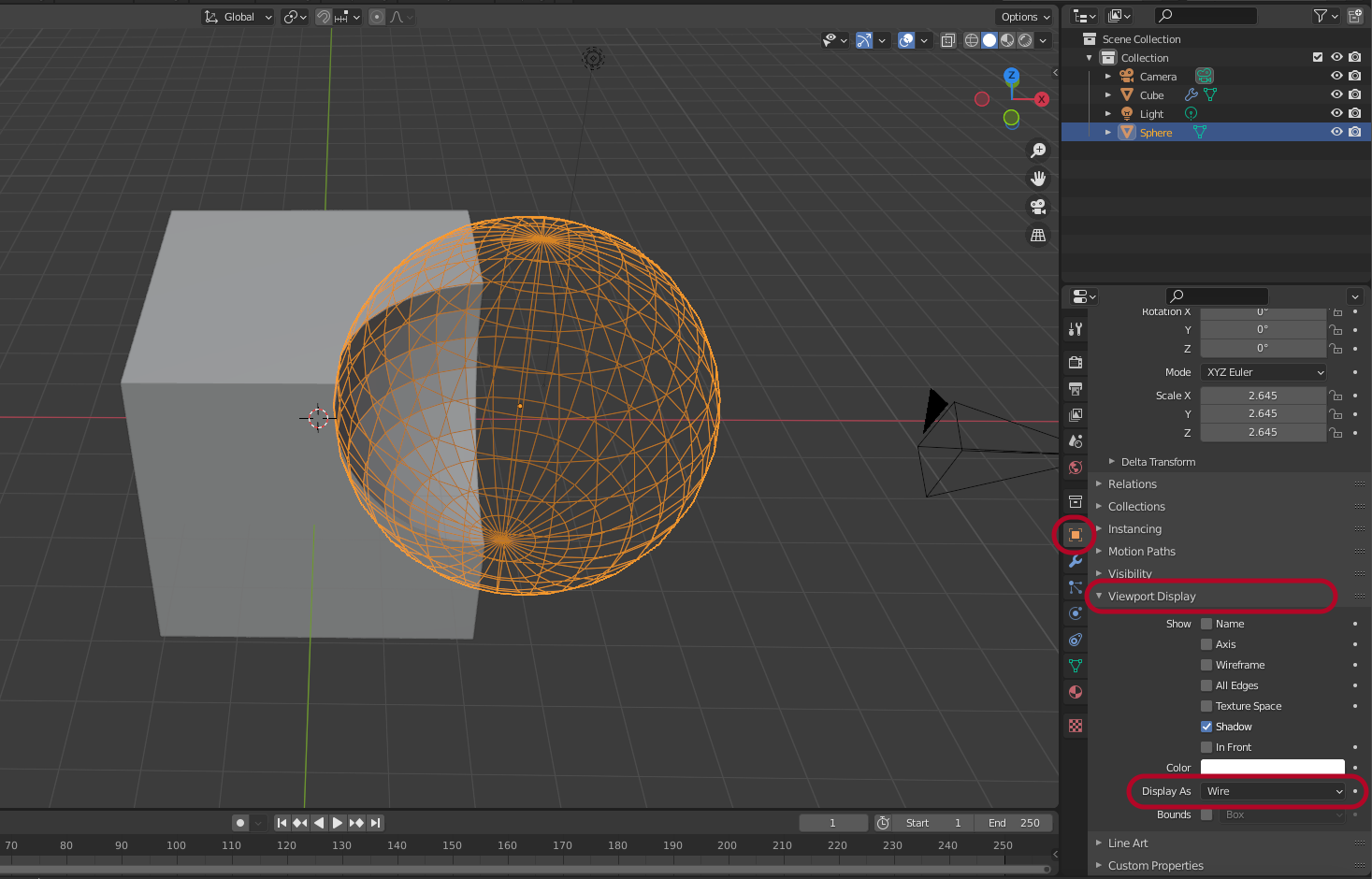 Sphere를 선택하고 Object Properties > Viewport Display > Display As를 Wire로 변경해서