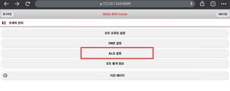 메뉴로 가서 ALG설정을 누릅니다.