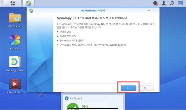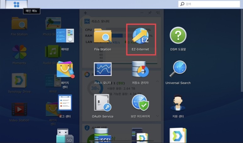 Nas에 로그인해서 메인 메뉴를 누릅니다.