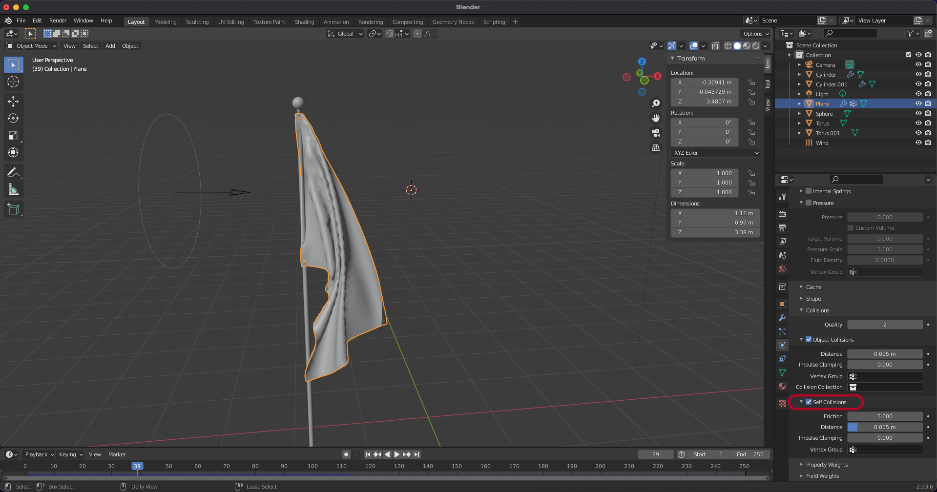 깃발을 선택하고 collision > self collision을 선택해서 서로 충돌하지 않도록 합니다.