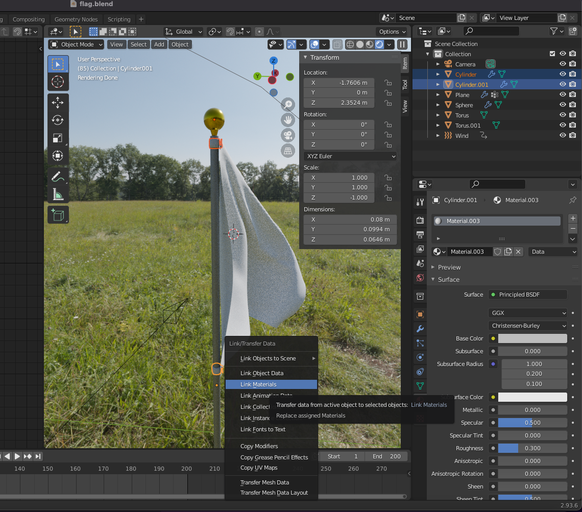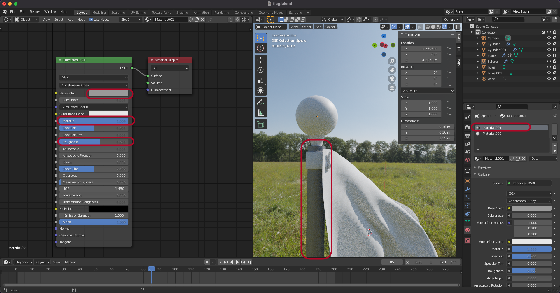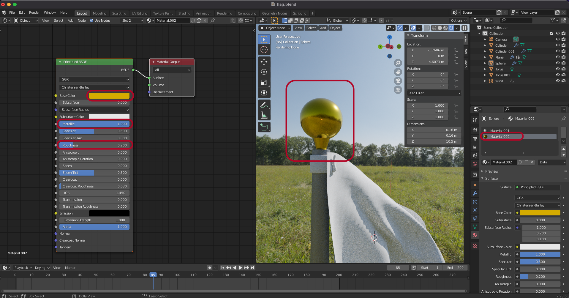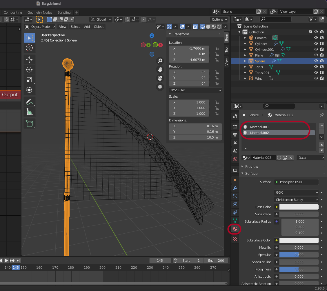 깃대를 선택하고 Material Properties에서 Material 2개를 추가합니다.