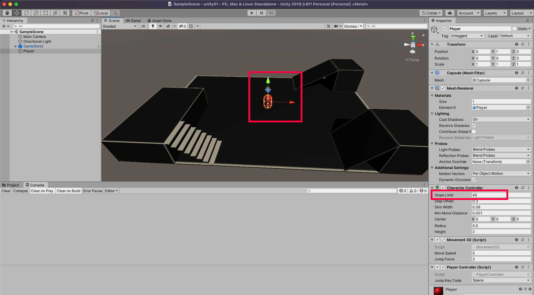 Character Controller의 Slope Limit 이 45도로 되어 있습니다.