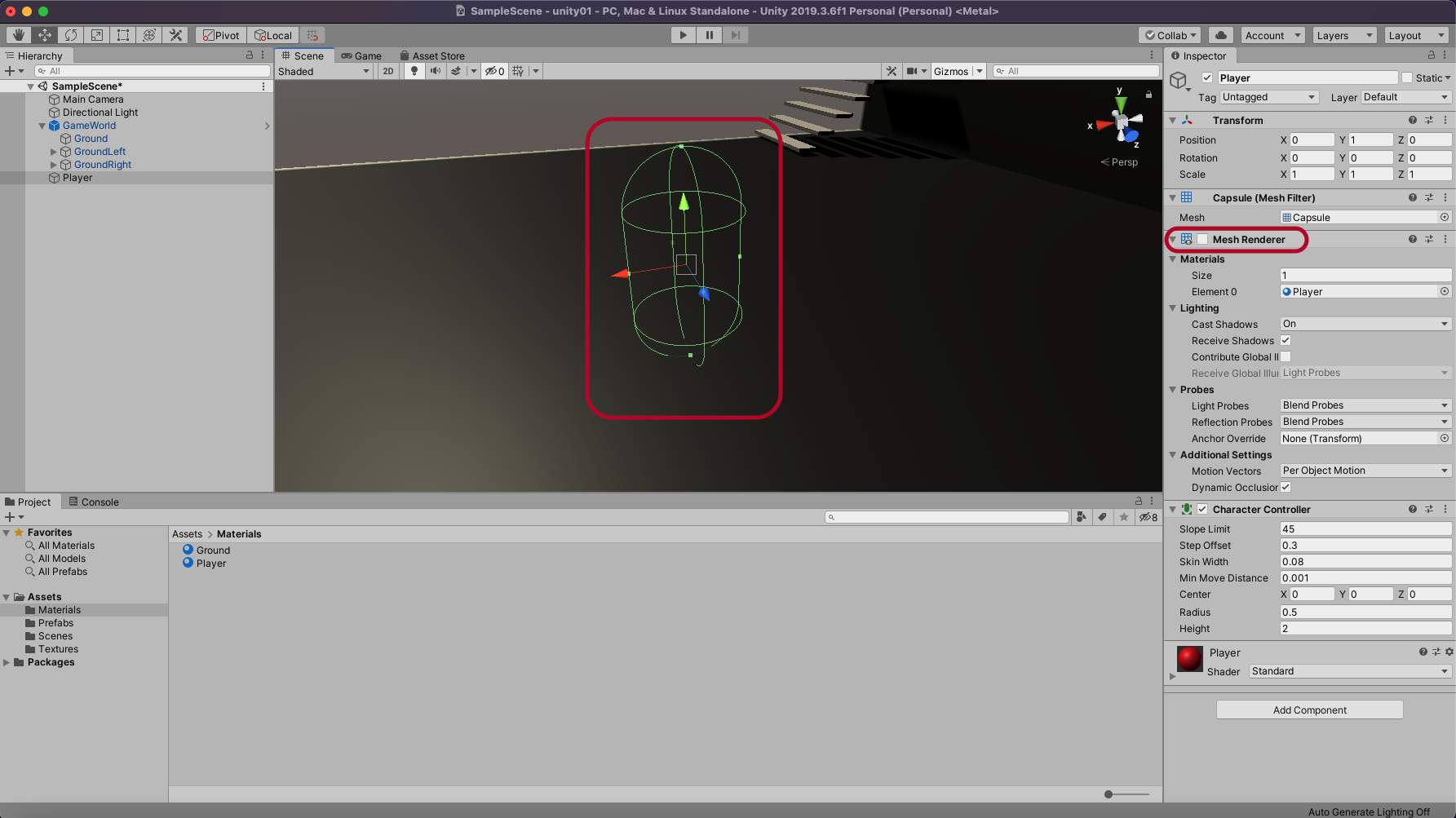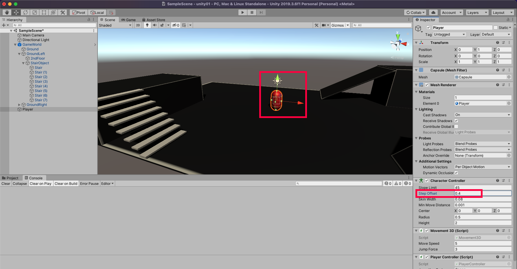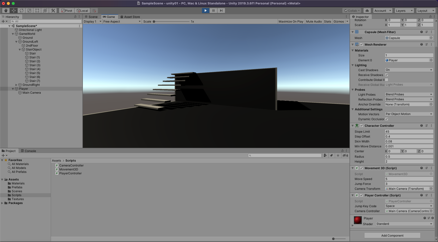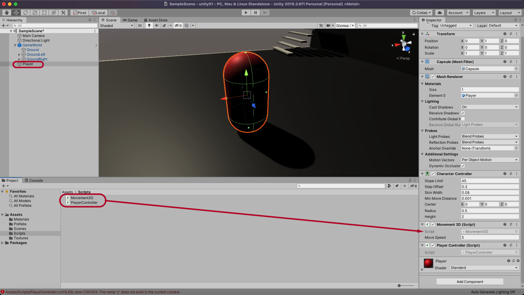 Player를 선택하고 Movement3D와 CharacterController 스크립트를 넣어 줍니다.