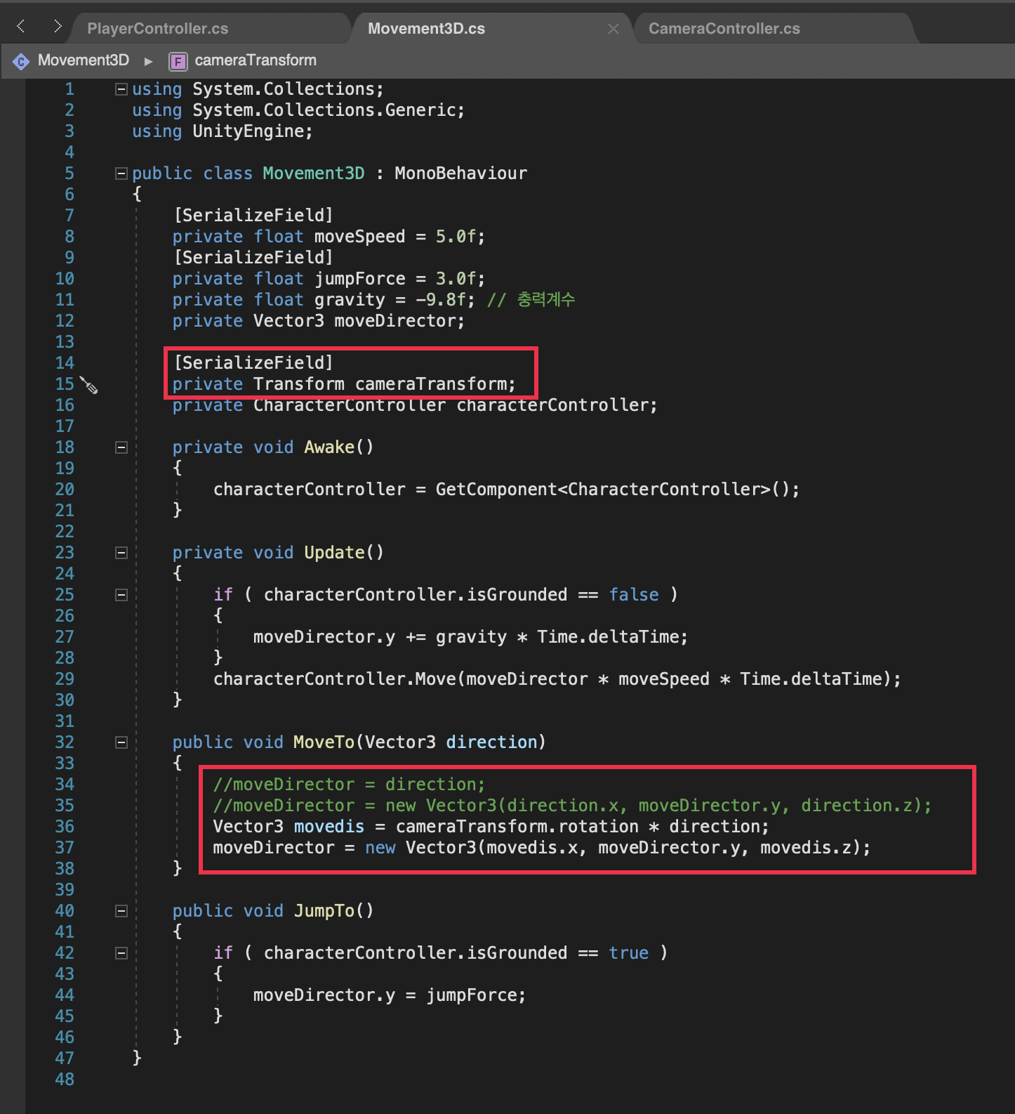Player > Movement 3D와 Player Controller에 각각 MainCamera를 연결해 줍니다.