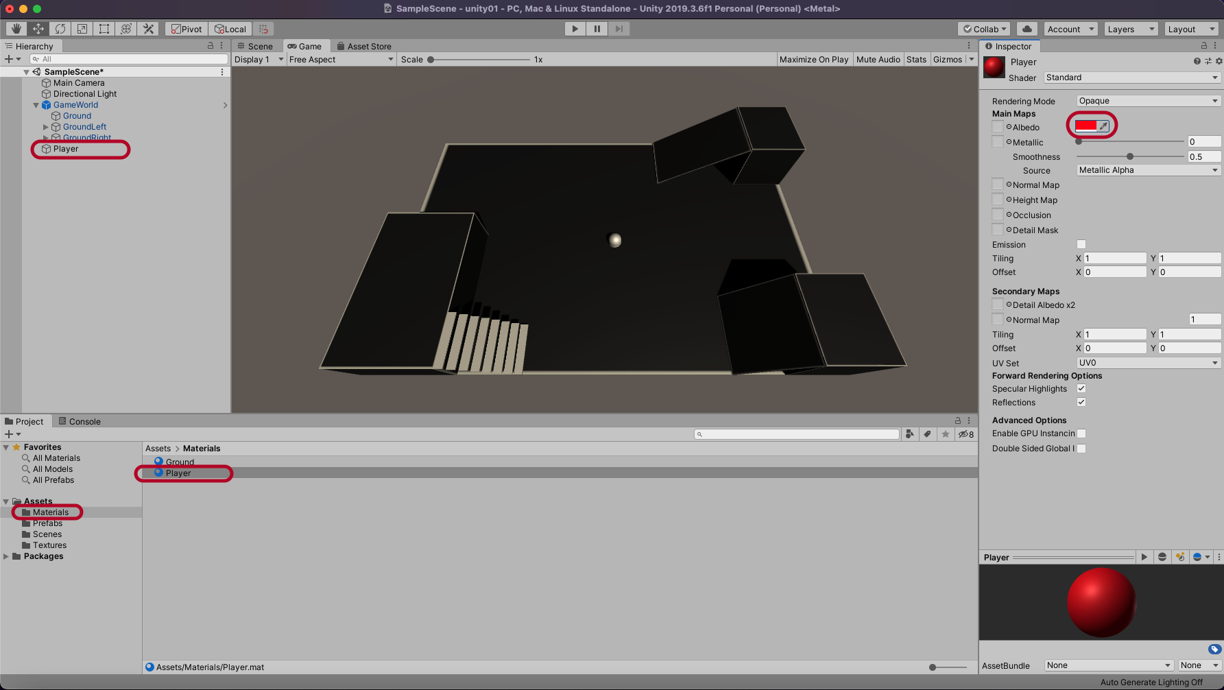 Material을 추가하고 Player로 이름 바꾸고 색깔은 빨간색으로 합니다.