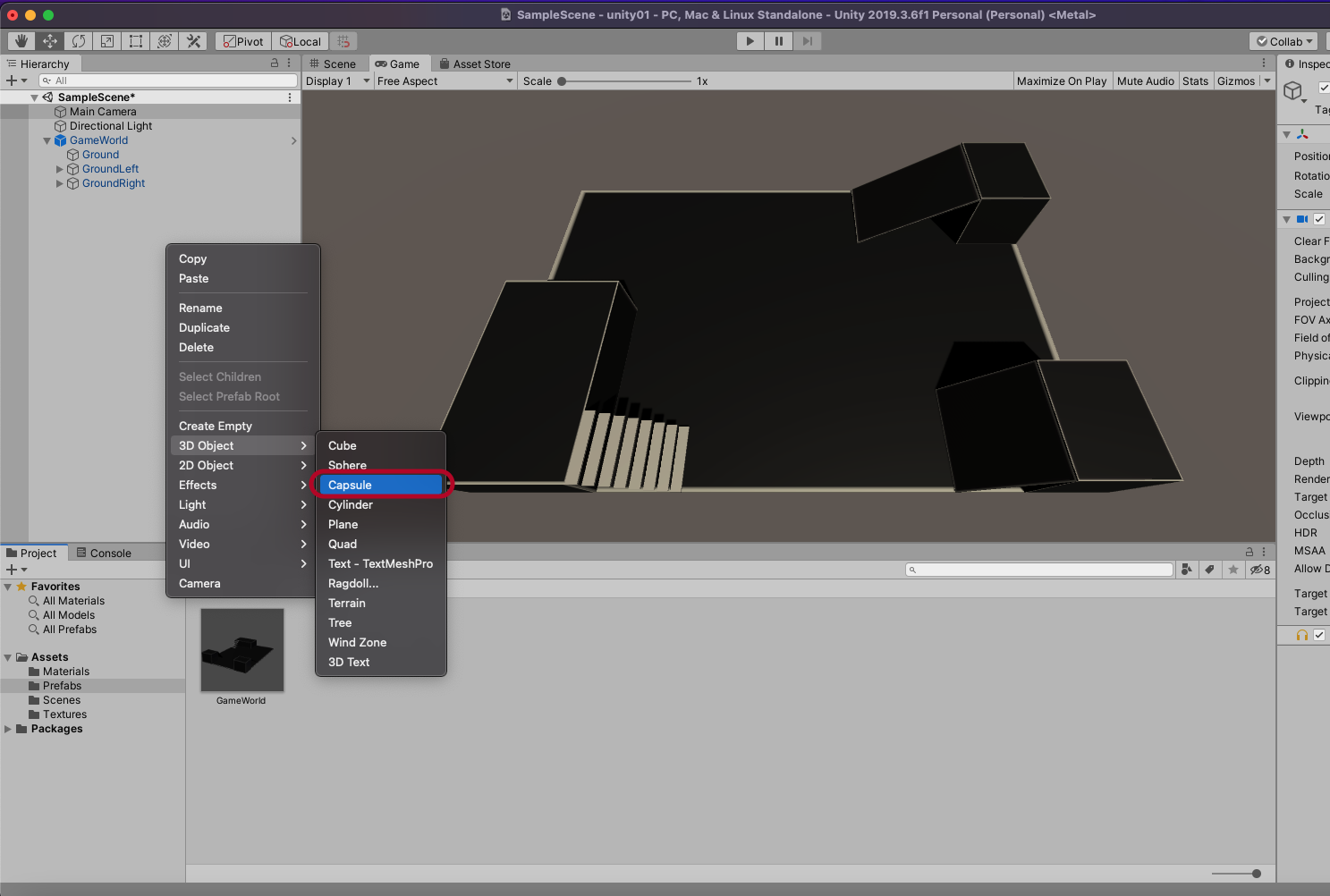 Prefabs의 GameWorld를 Scene에 올립니다.