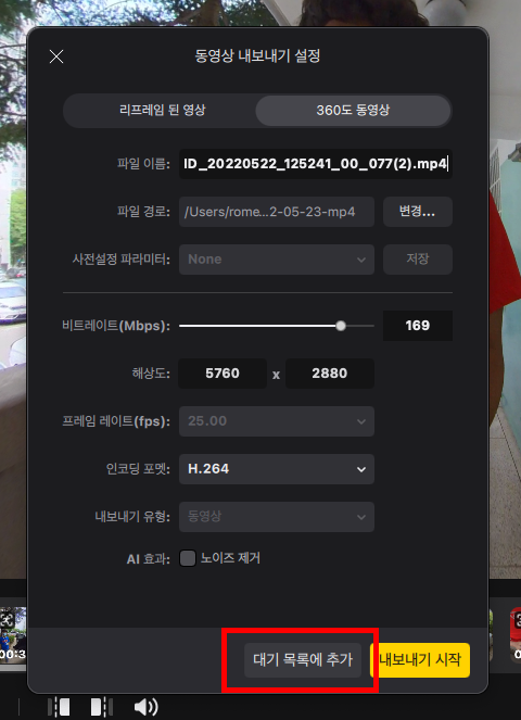 360도 동영상을 선택하고 대기목록에 추가 버튼을 누릅니다.