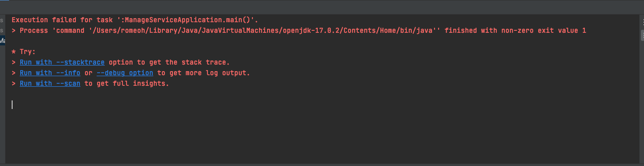 Execution failed for task ':ManageServiceApplication.main()'.