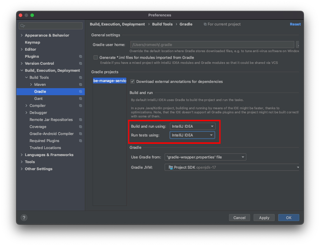 Build, Execution, Deployment > Build Tools > Gradle 로 이동해서