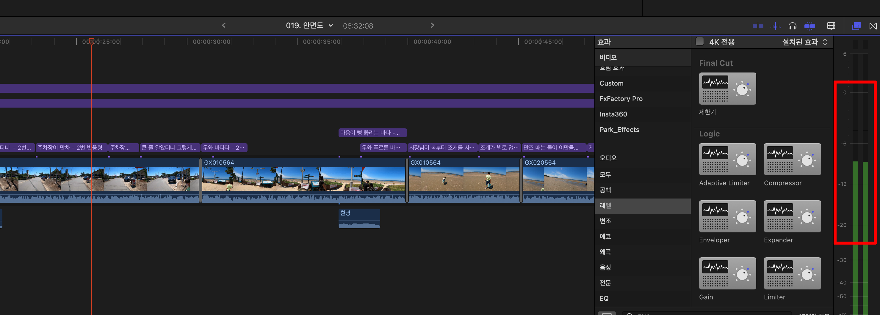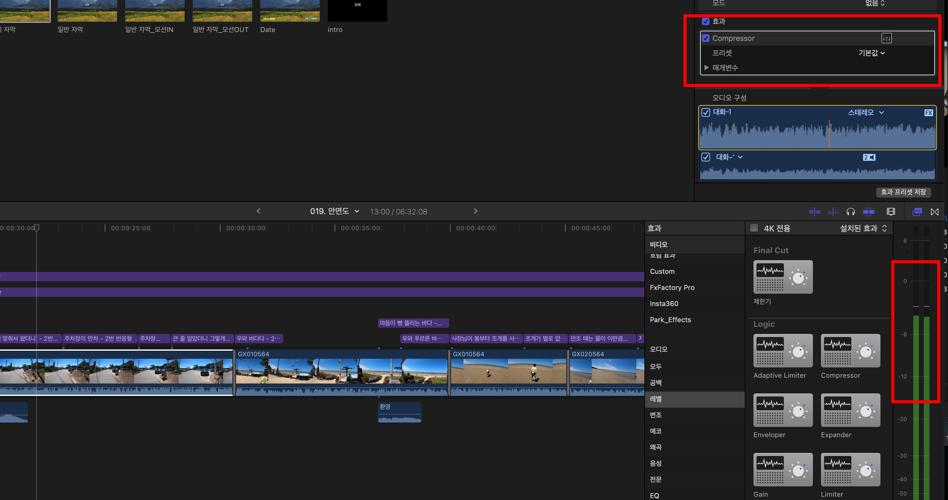 오디오 > 레벨에서 Compressor를 클립에 적용합니다.