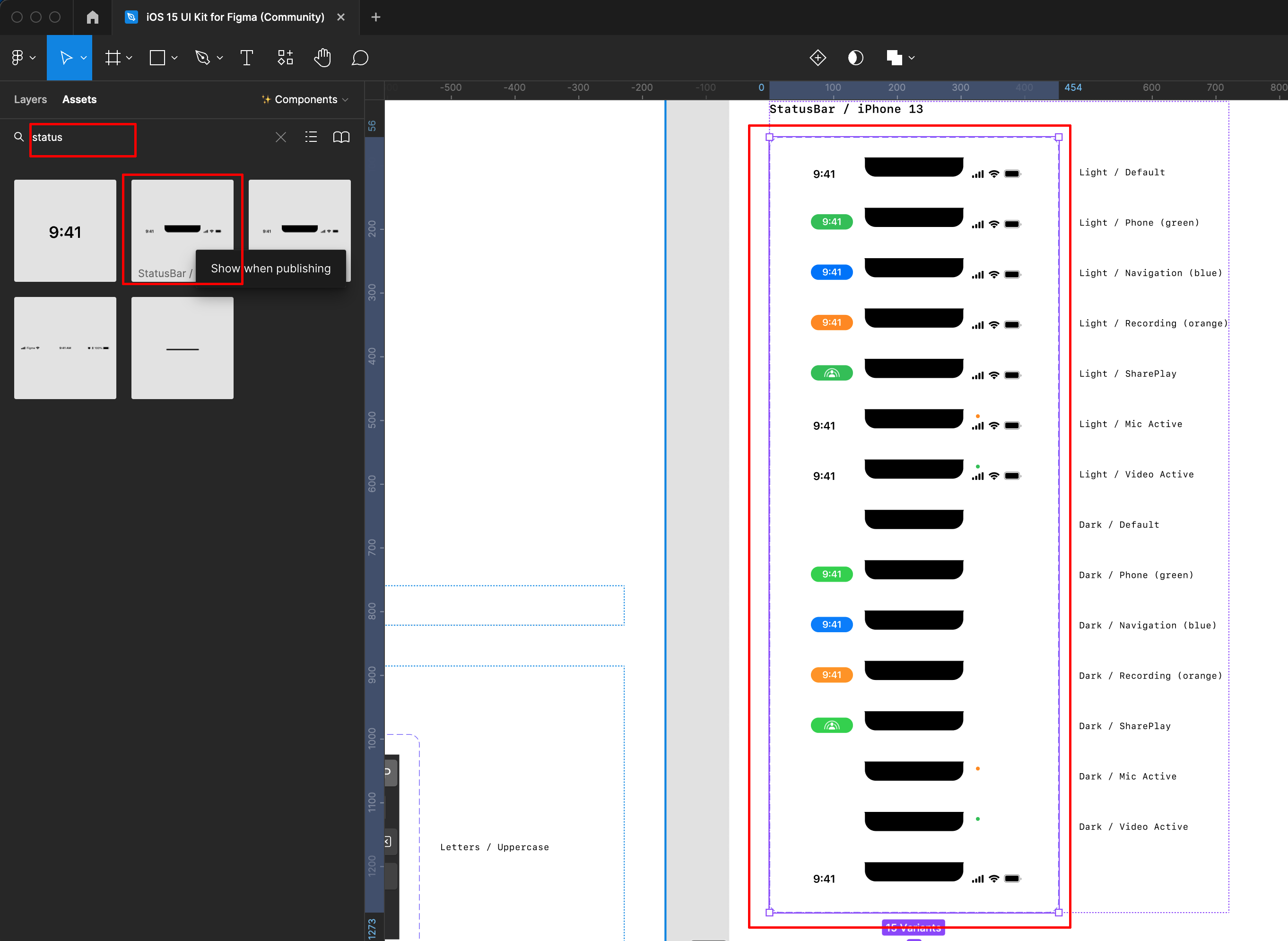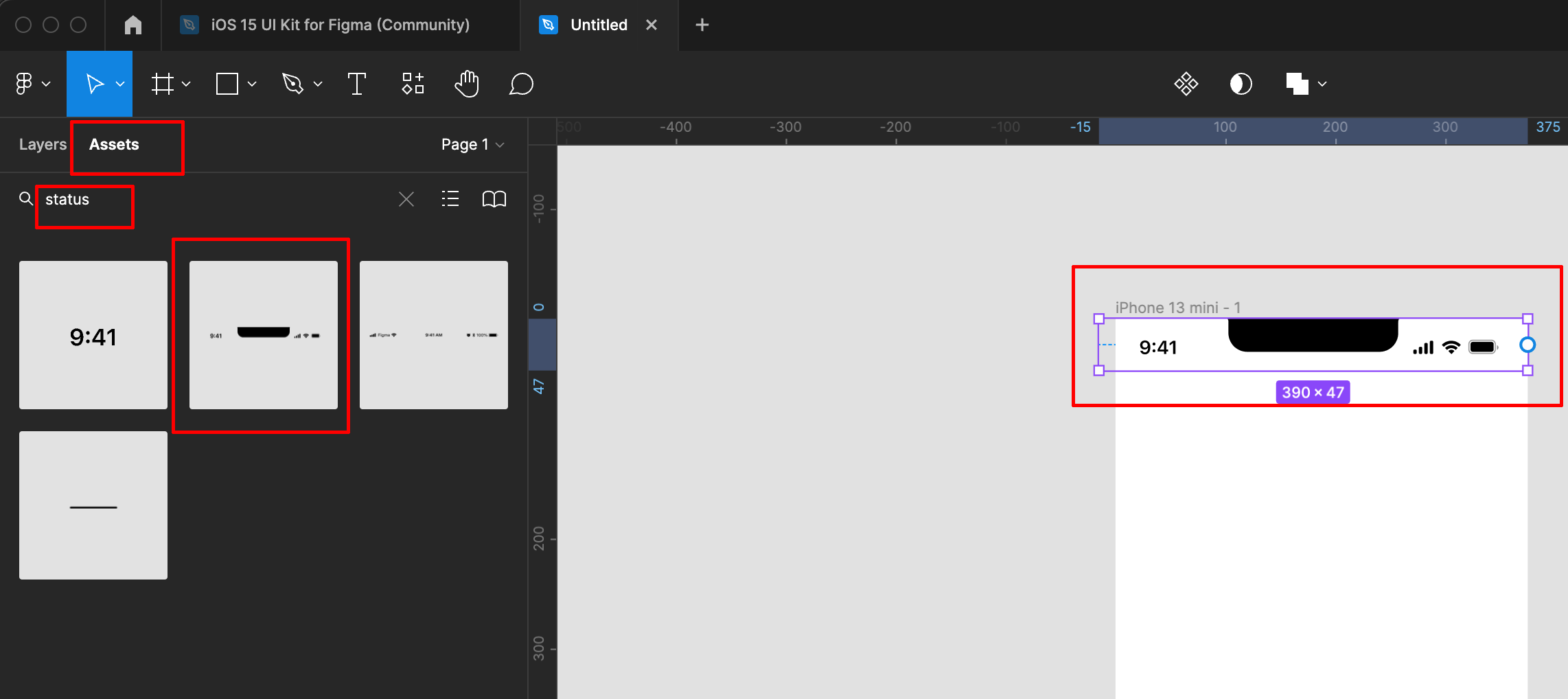 Assets에서 status를 검색해서 마우스 오른쪽 클릭 Shift + 2를 눌러 ios Status 디자인 을 확인 할 수 있습니다.