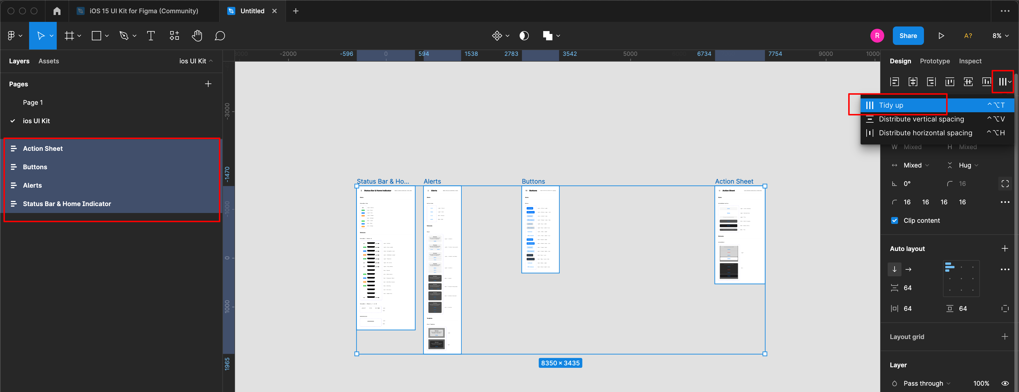 프레임을 모두 선택해서 Tidy up을 선택합니다.
