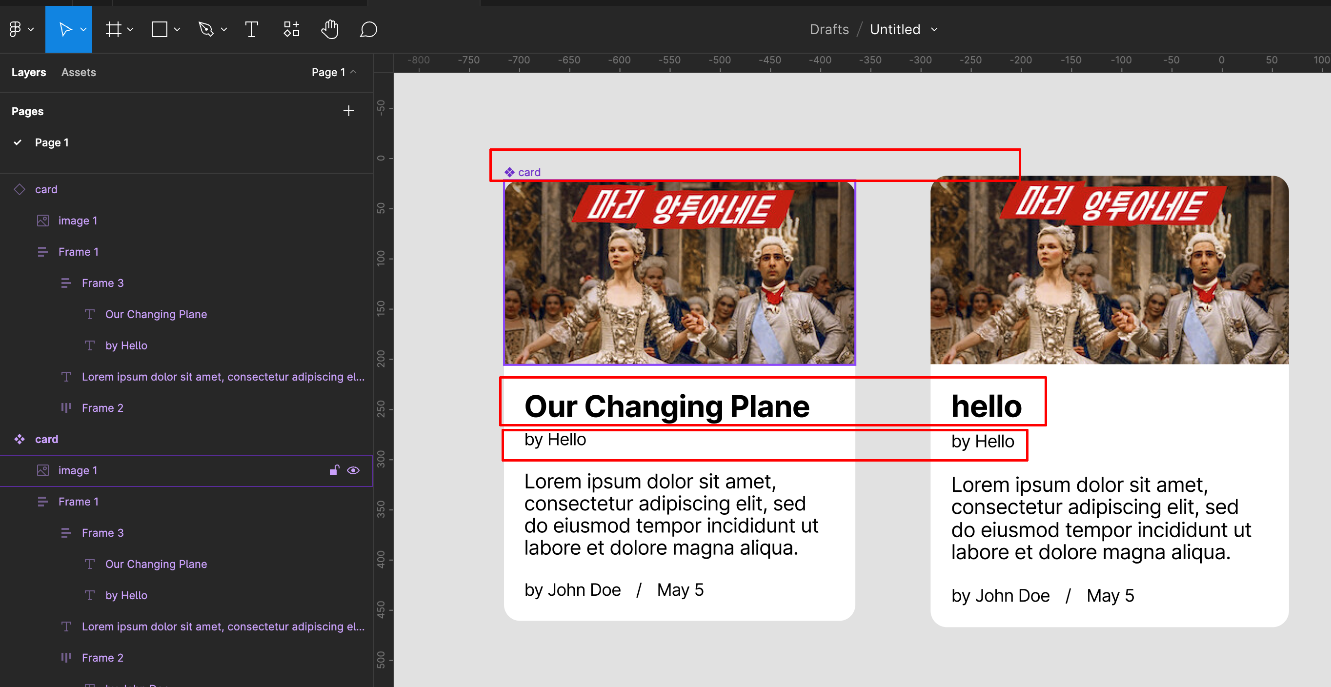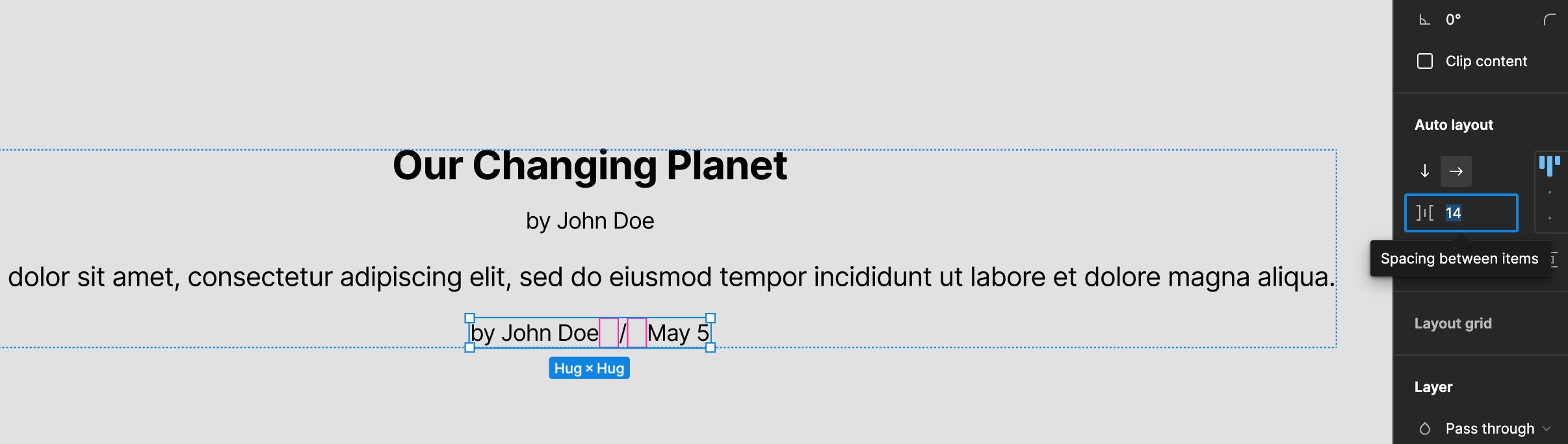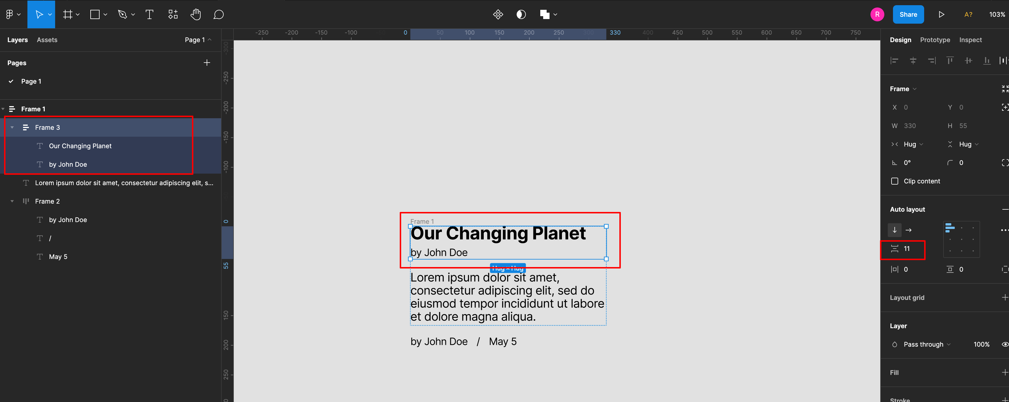 제목과 이름을 선택해서 auto layout으로 합치고 간격을 수정합니다.