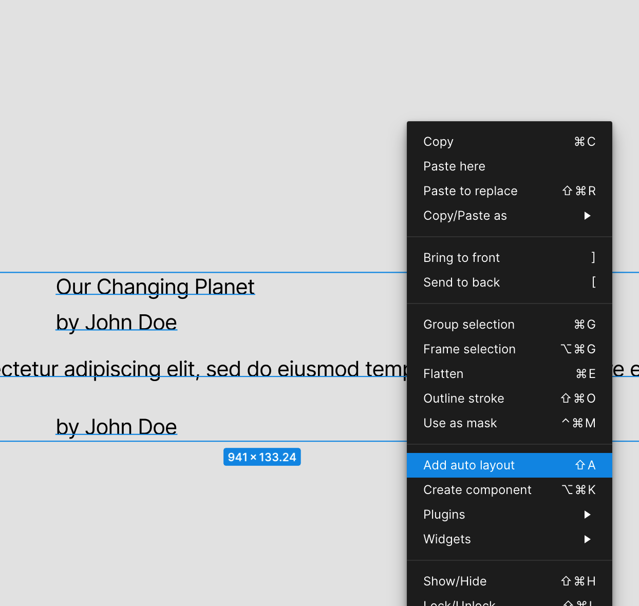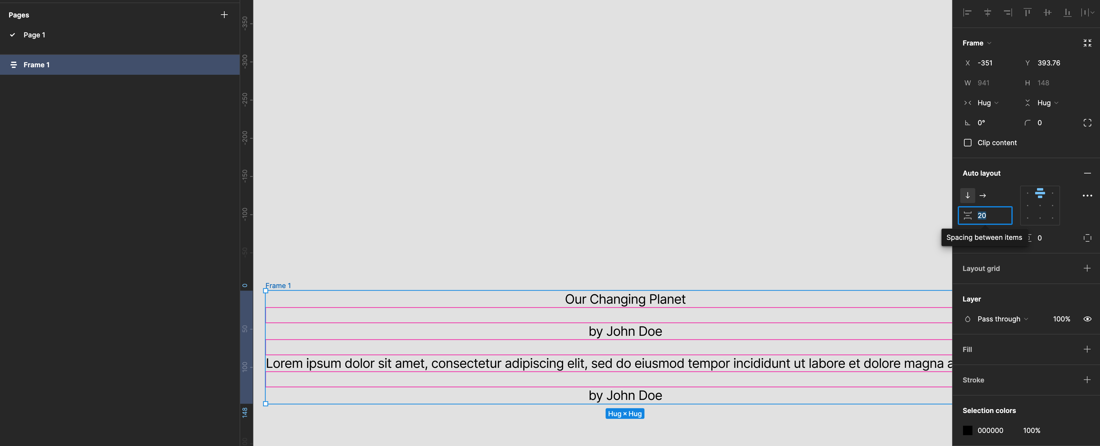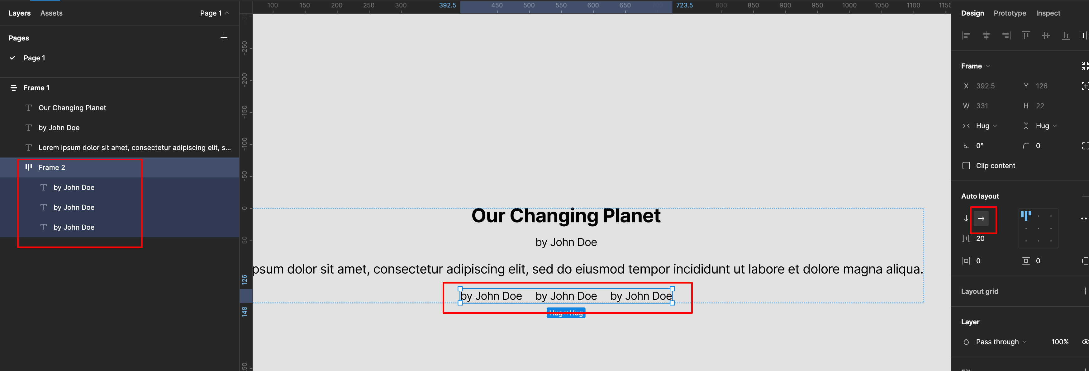 제목과 이름을 선택해서 auto layout으로 합치고 간격을 수정합니다.