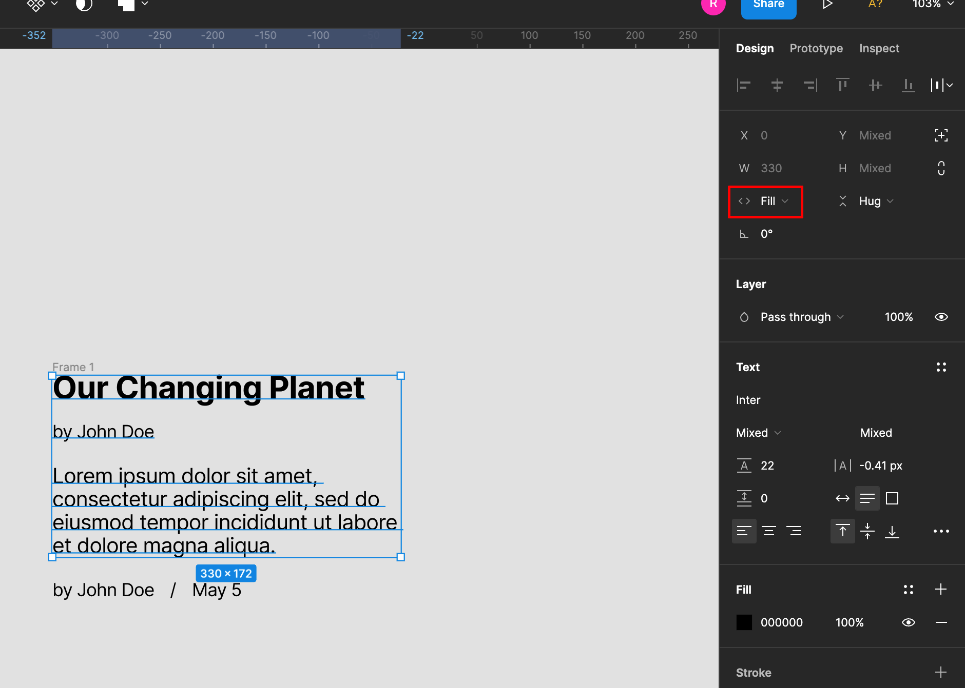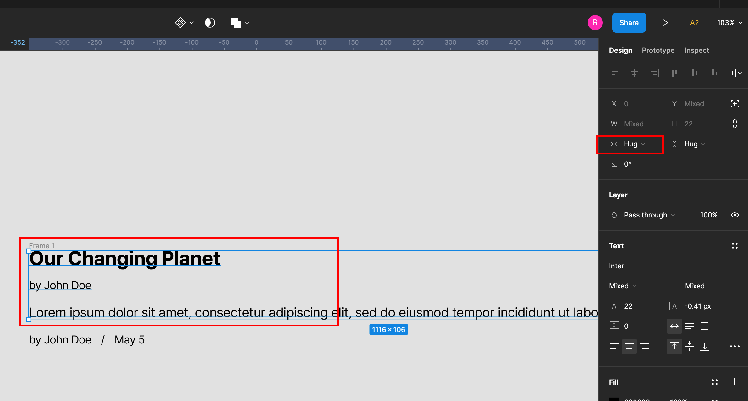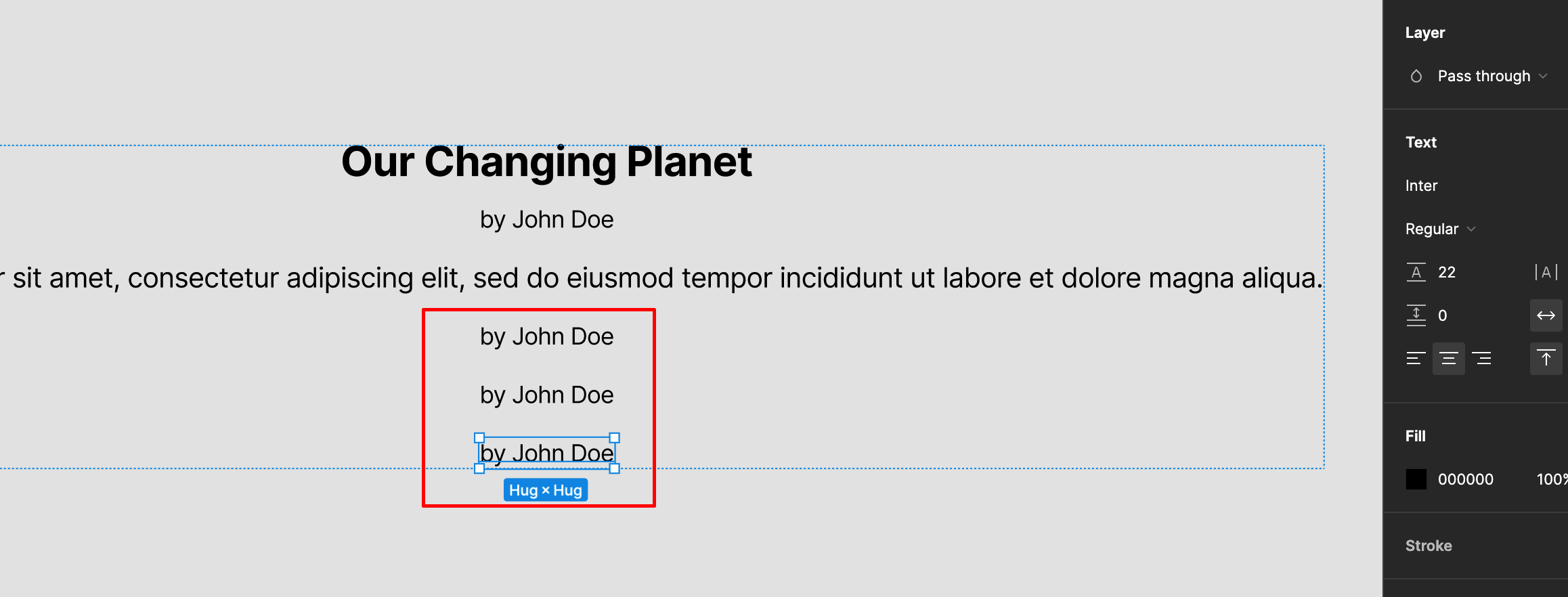 각 텍스트를 선택해서 가로가 hug content로 되어 있는것을 fill container로 변경합니다.