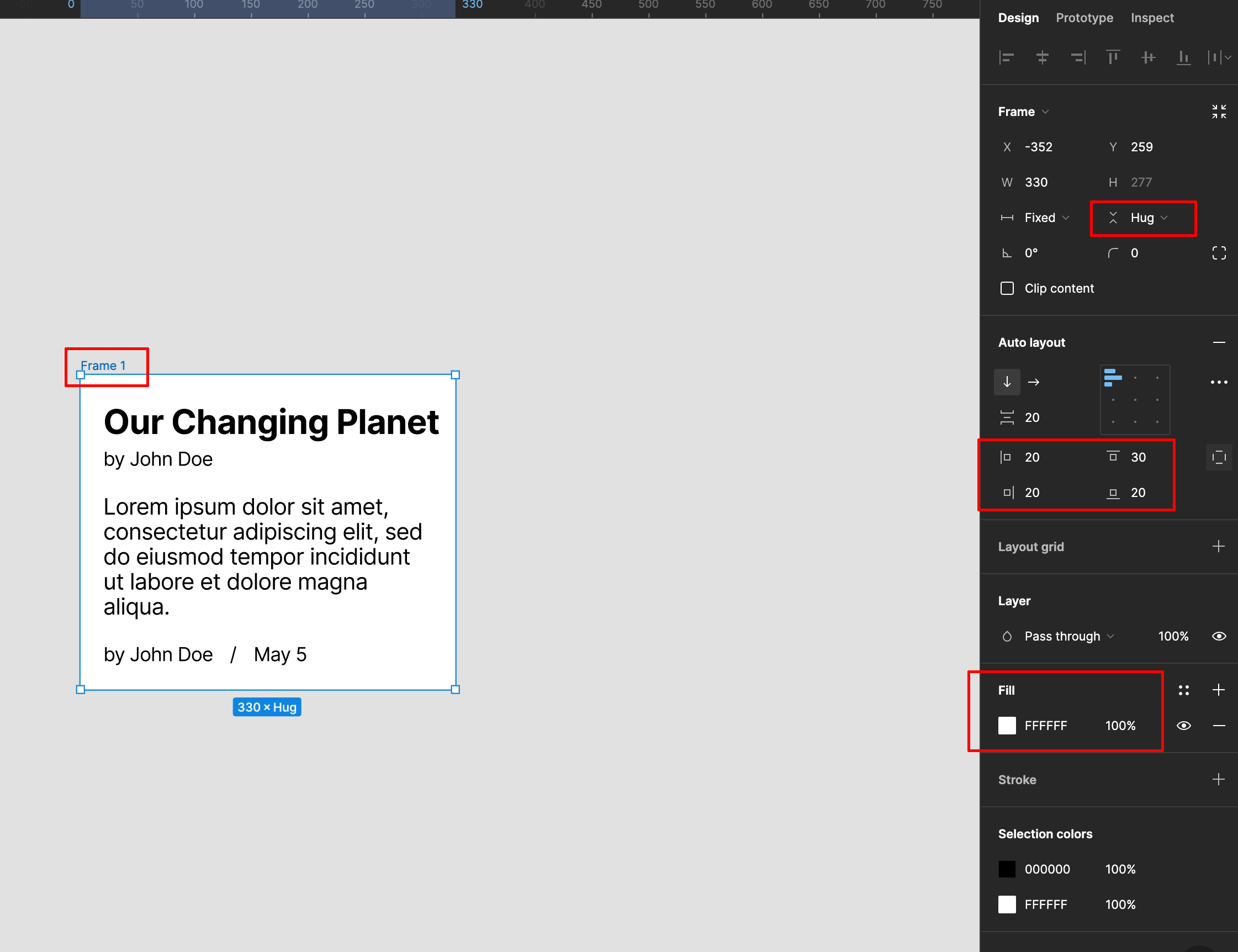 frame1의 높이를 hug content로 설정하고 fill 과 padding을 설정합니다.