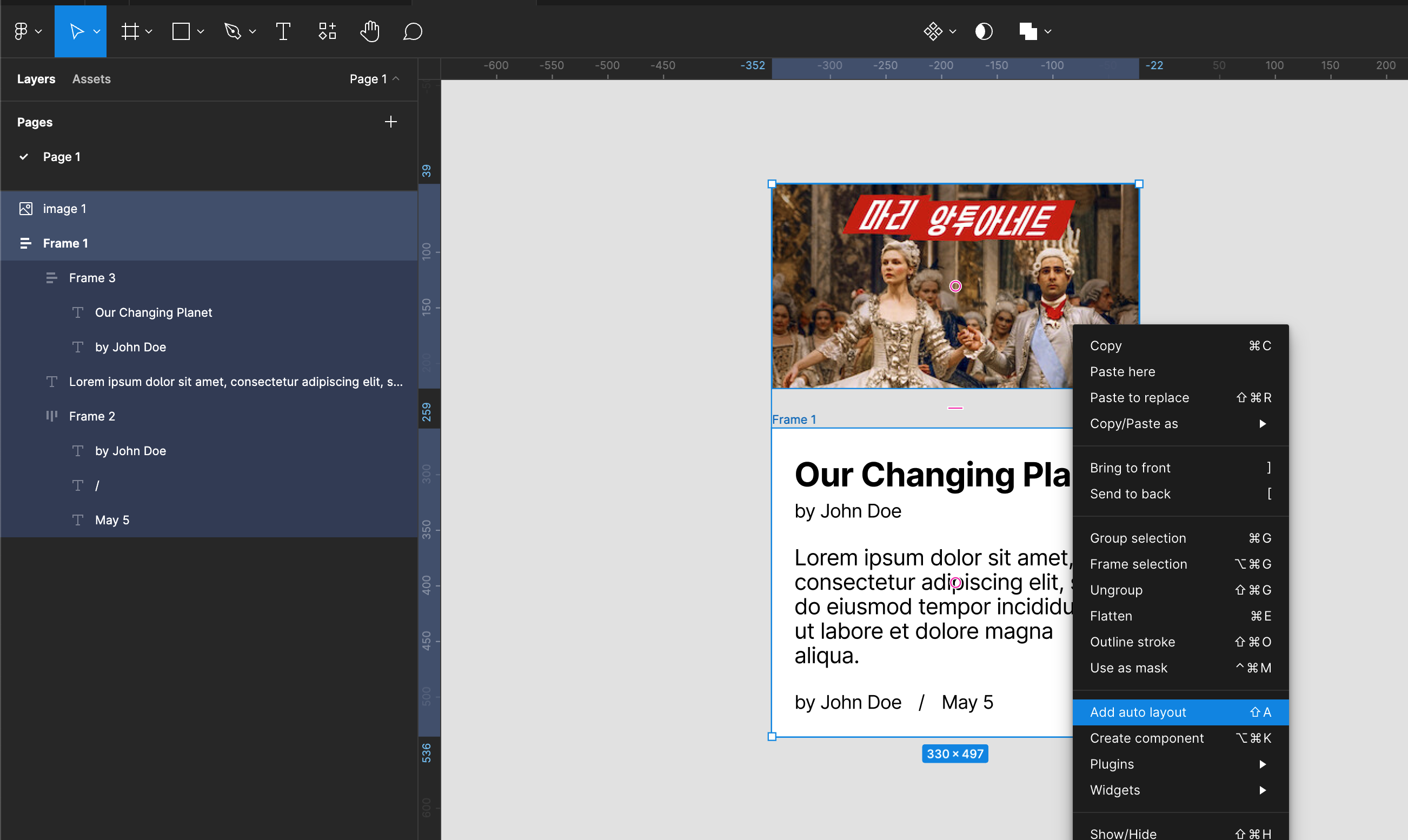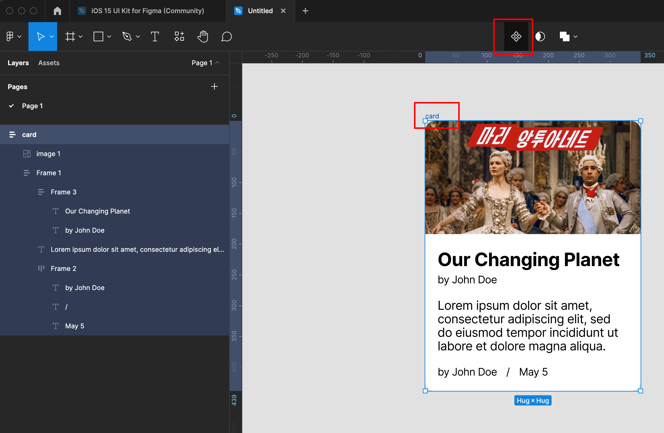 이미지와 frame1을 선택하고 add auto layout합니다.