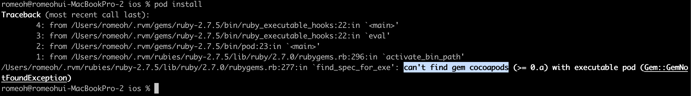 pod install시 can't find gem cocoapods 오류
