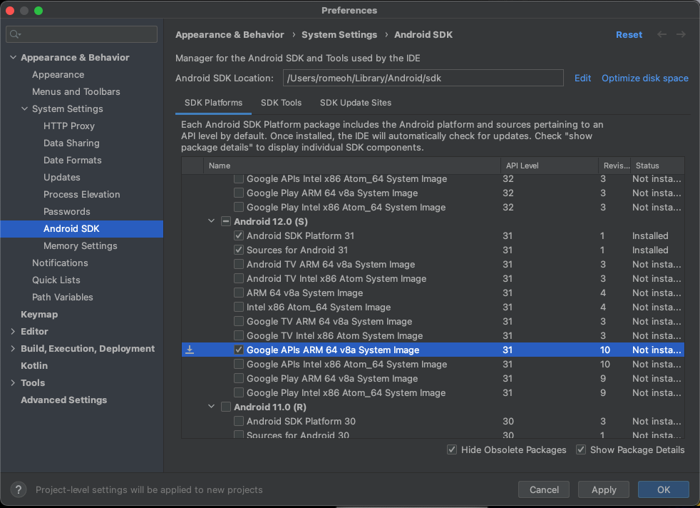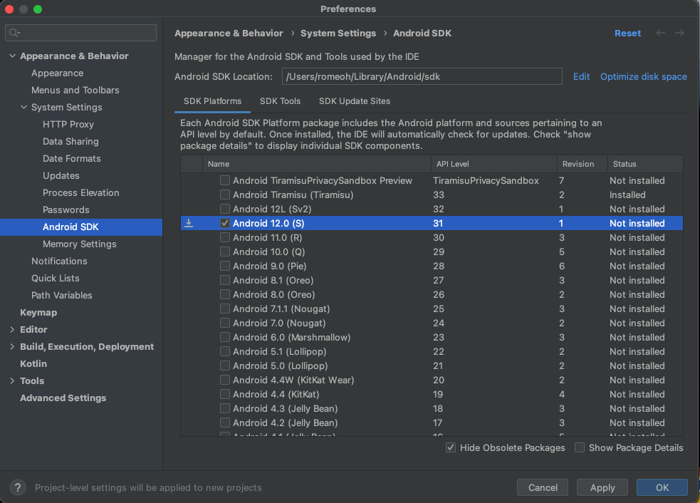 Android 12.0 (S)를 체크하고, Show Package Details에서