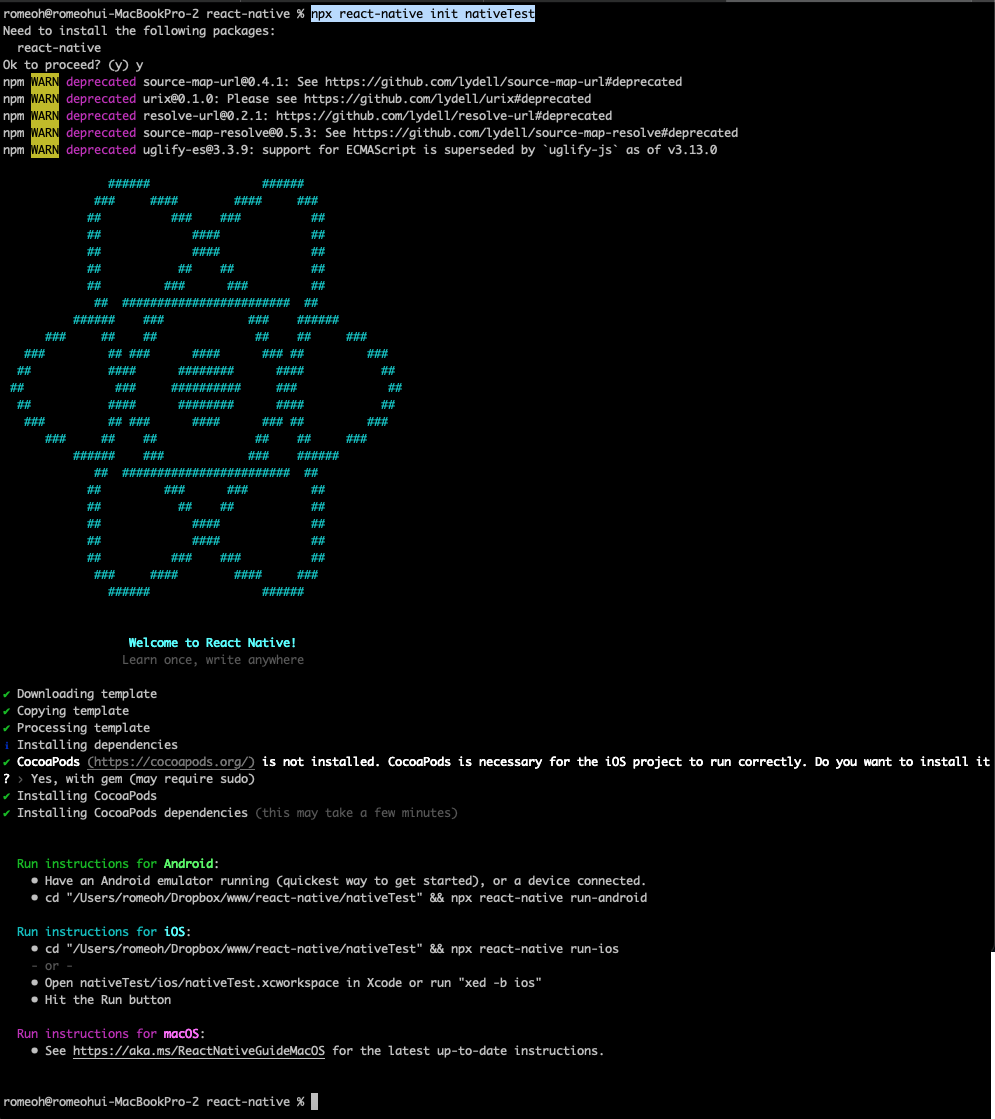 $ npx react-native init nativeTest --template react-native-template-typescript