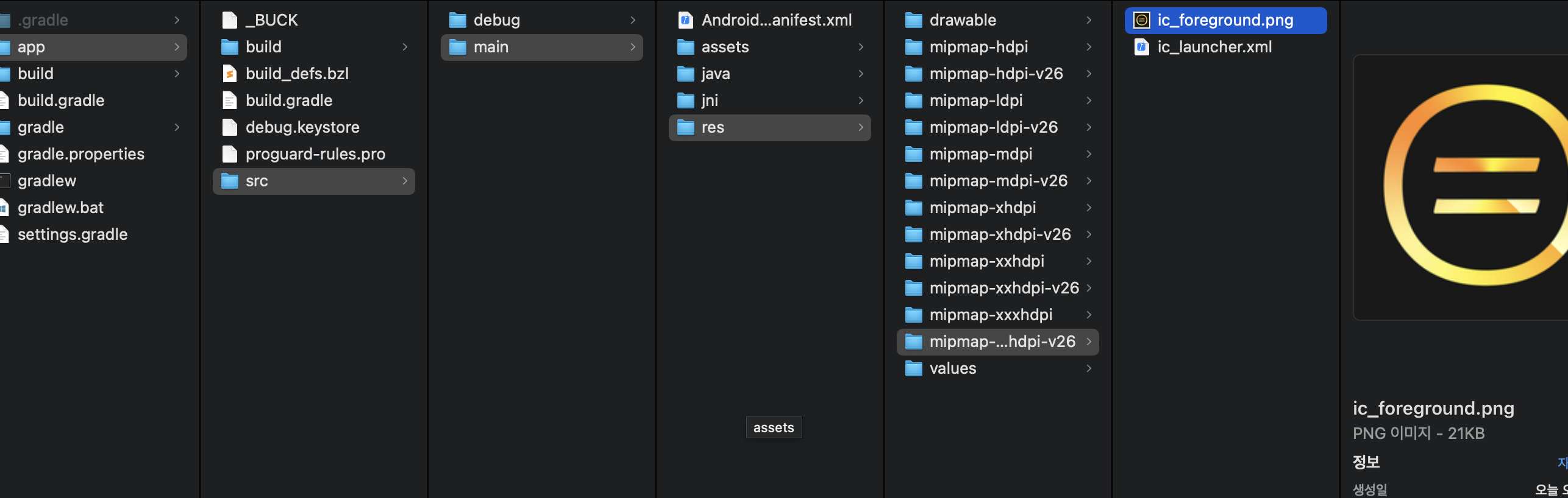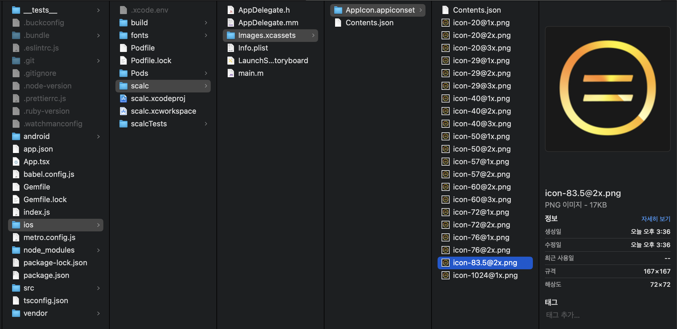 Android와 ios에 아이콘이 사이즈 별로 생성되었습니다.