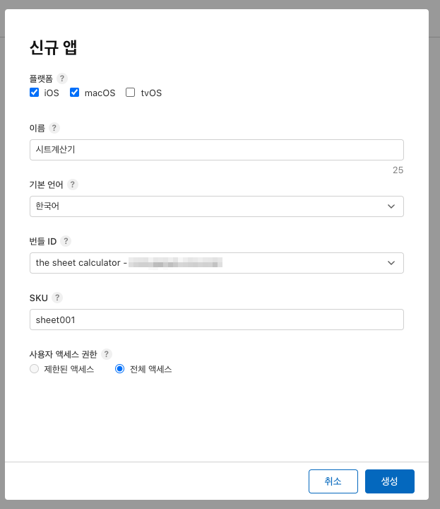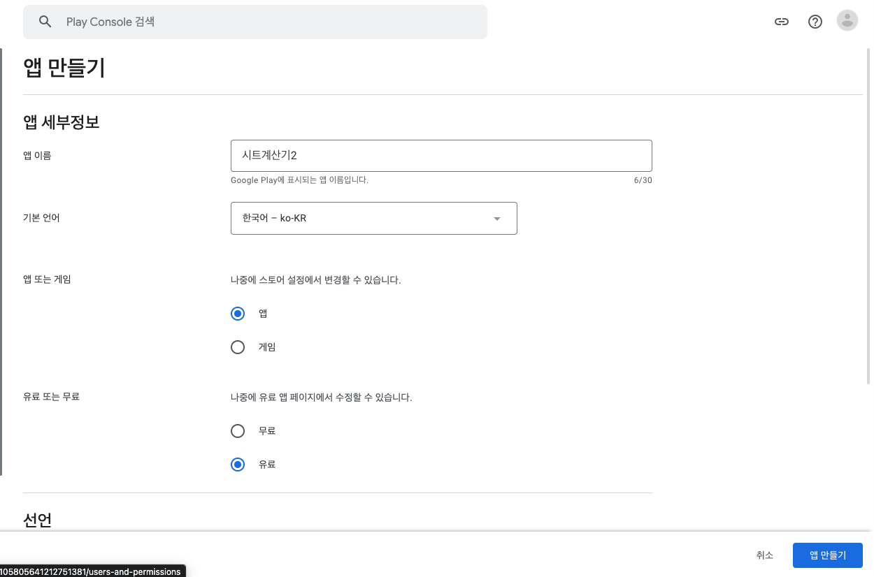 앱이름과 종류 등을 설정하고 앱 만들기 합니다.