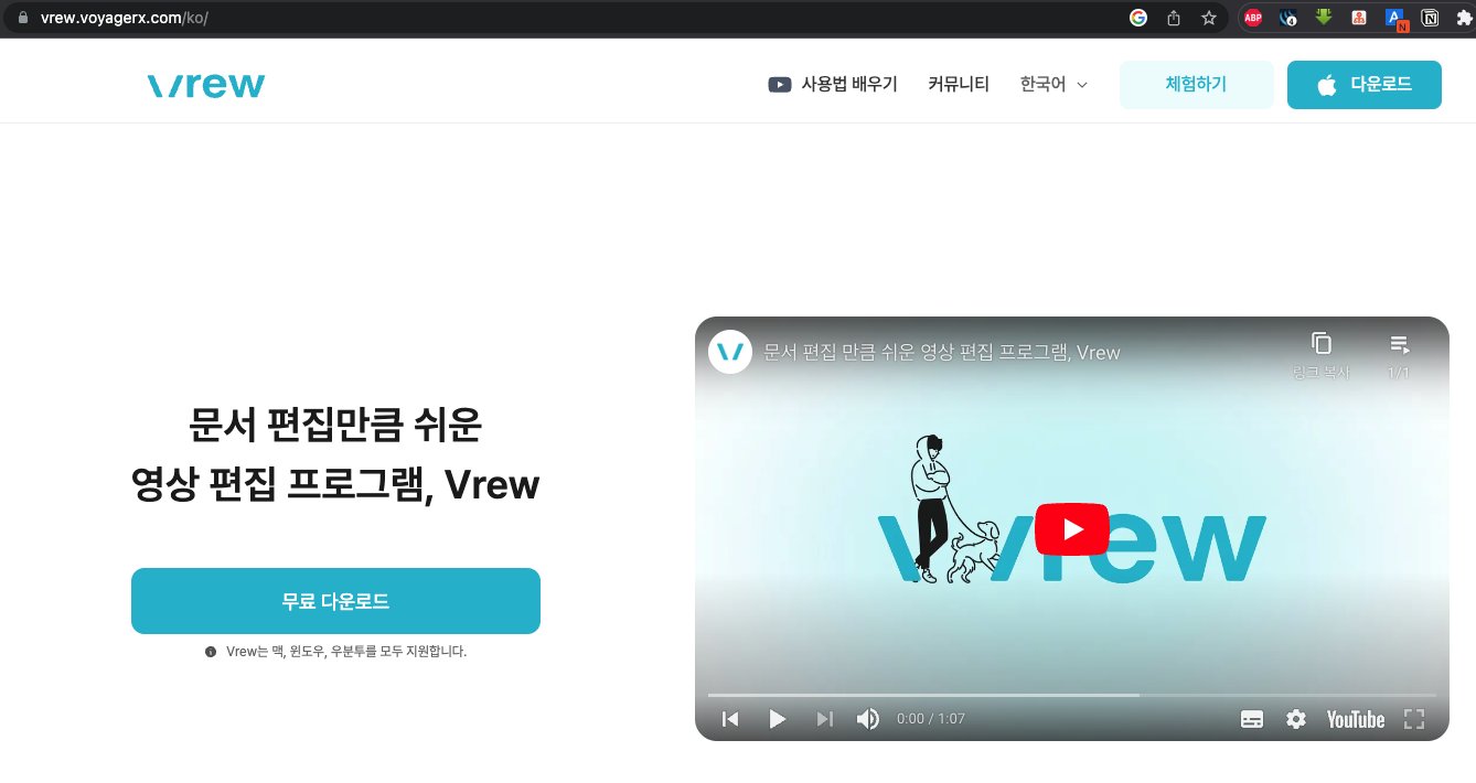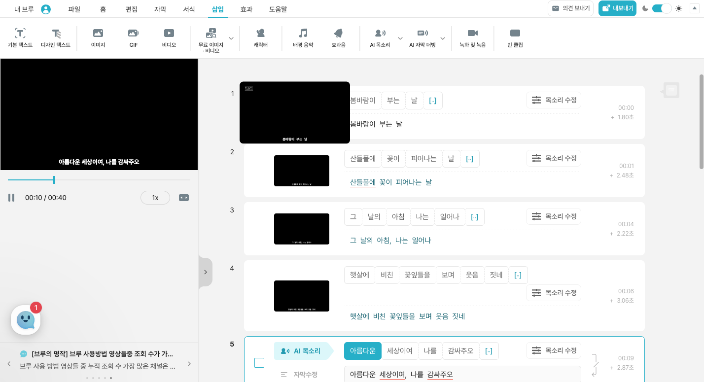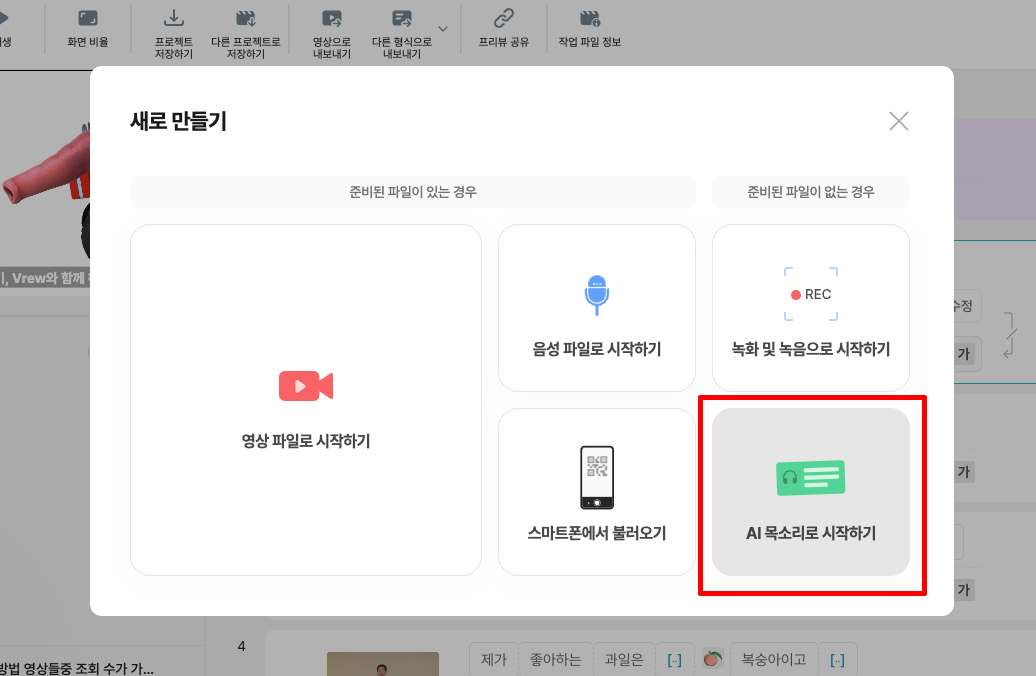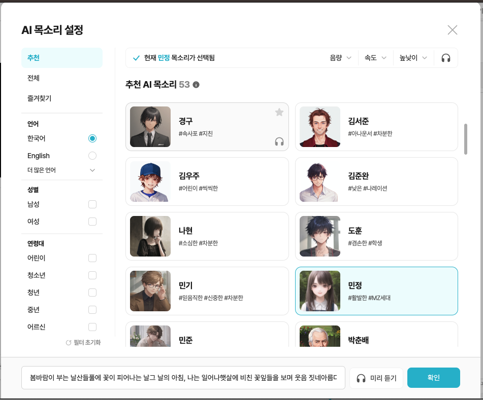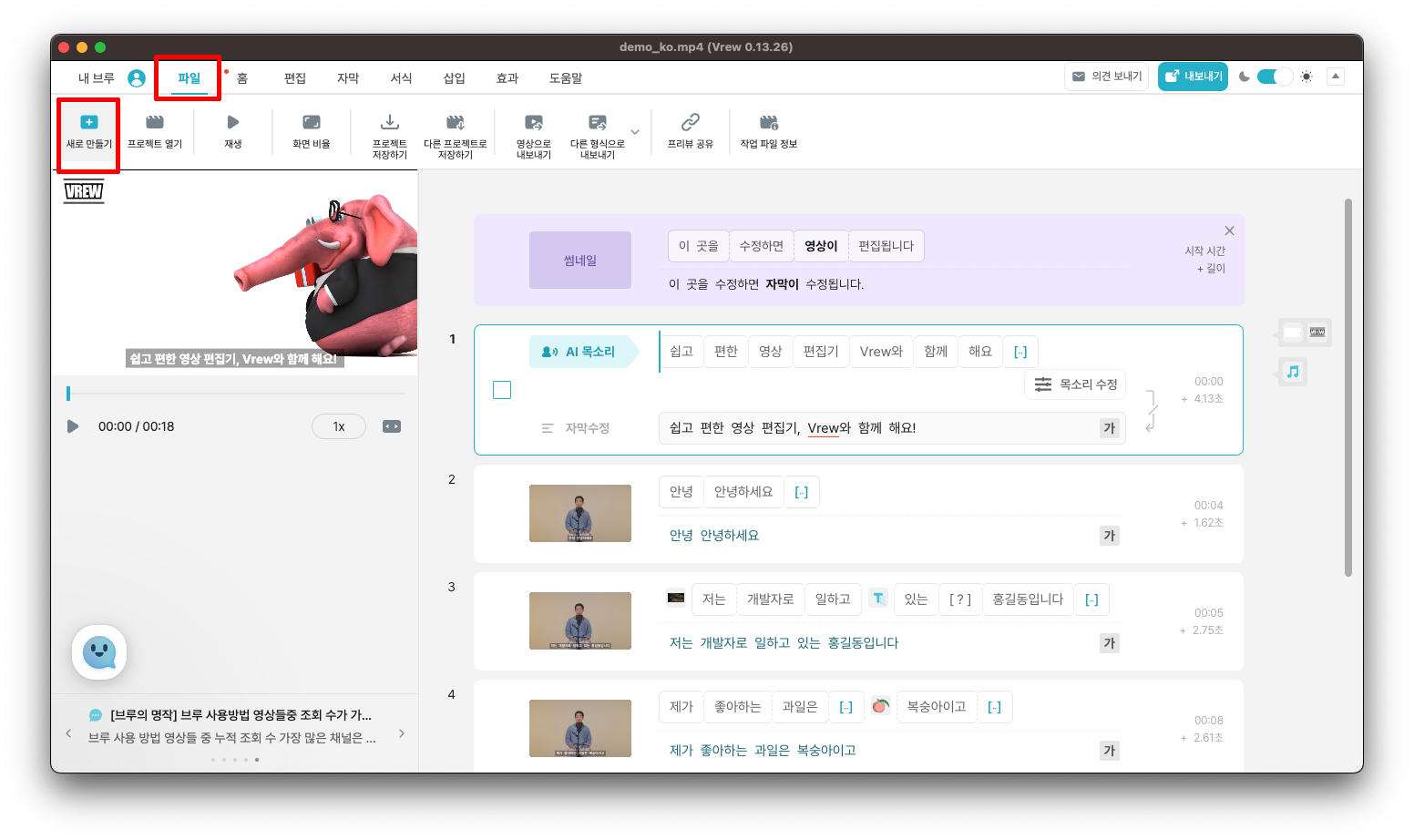 Vrew는 입력한 텍스트를 원하는 음성파일로 만들어 줍니다.