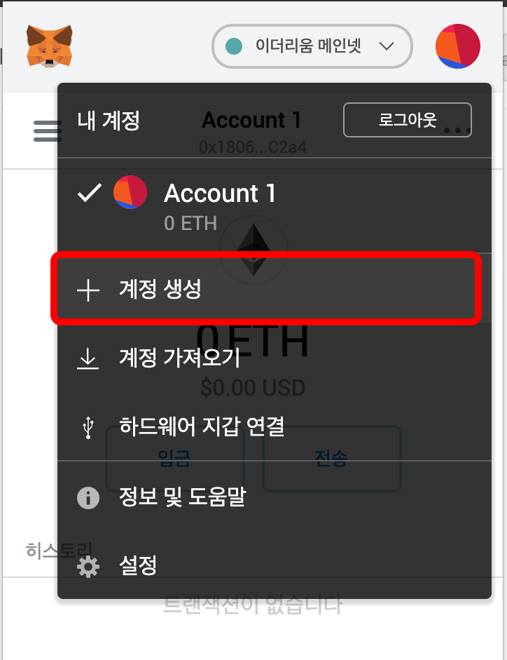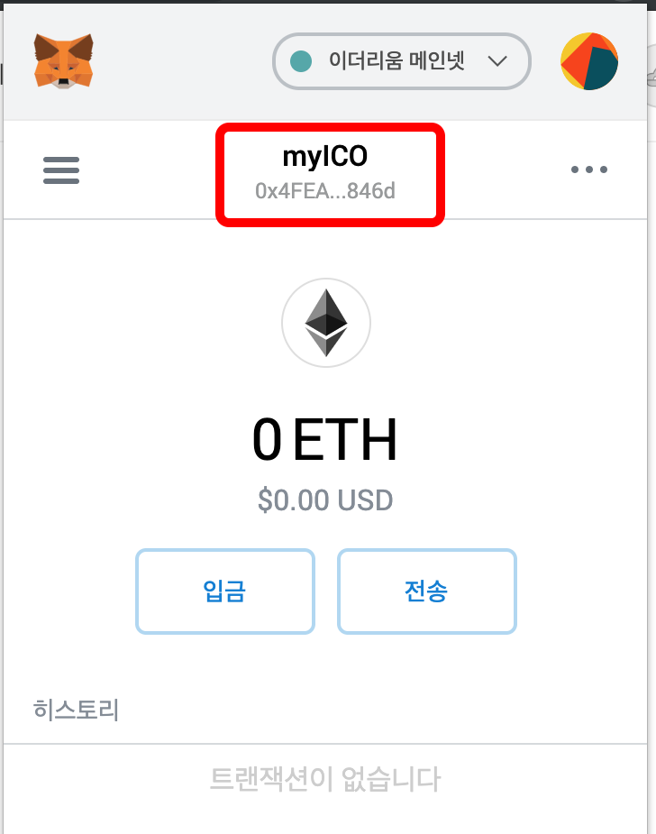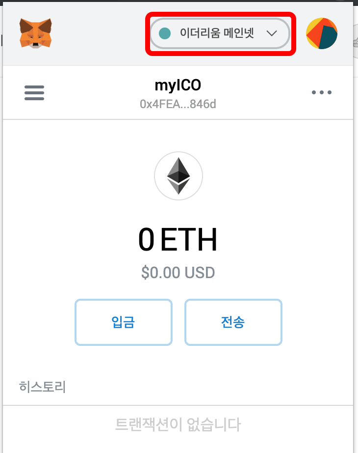 지갑의 상단에 이더리움 메인넷은 실제 이더리움 코인을 거래할 수 있는 지갑을 의미합니다.