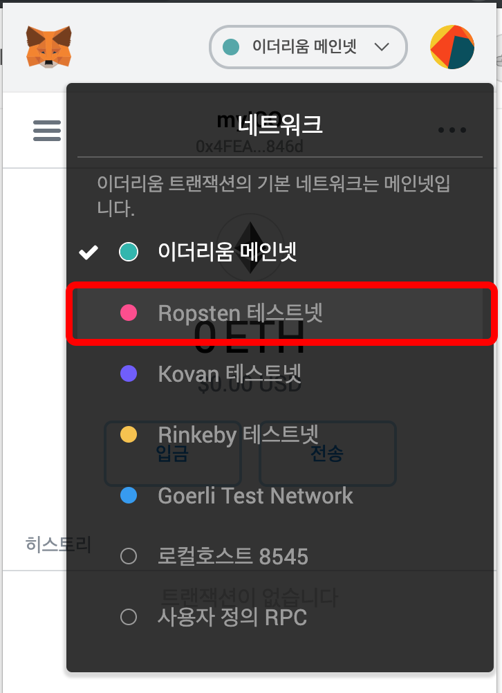 메인넷을 Ropsten 테스트넷으로 변경합니다.