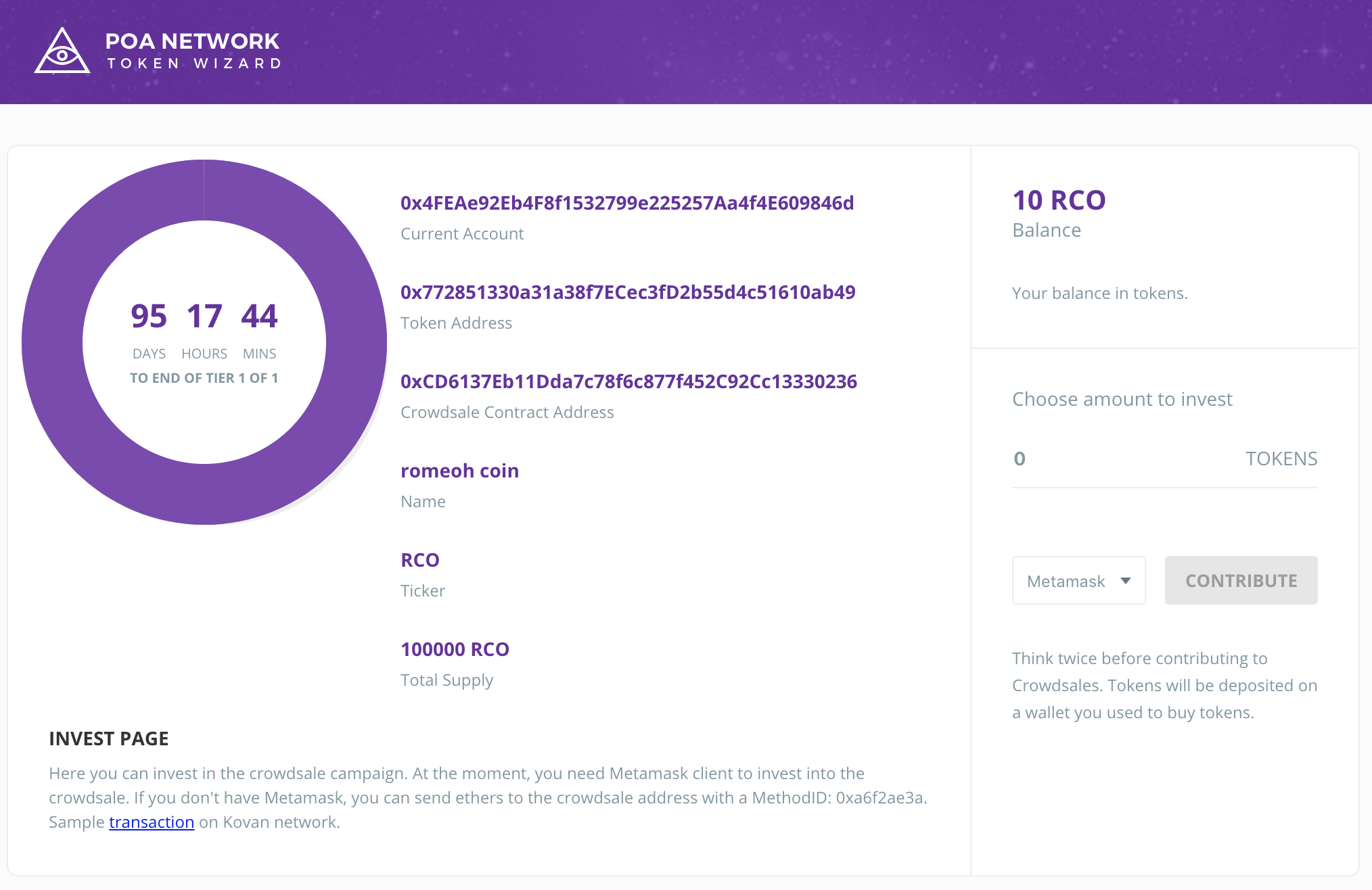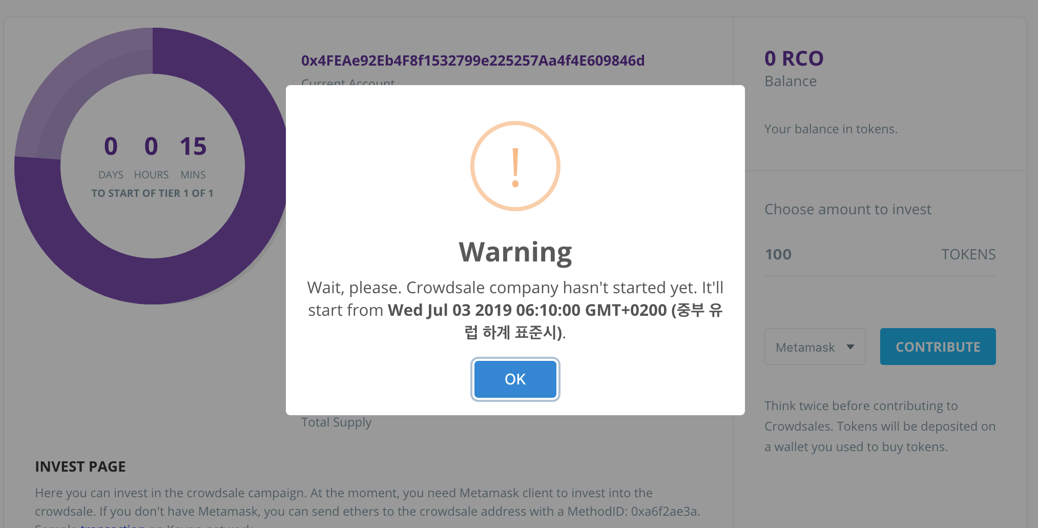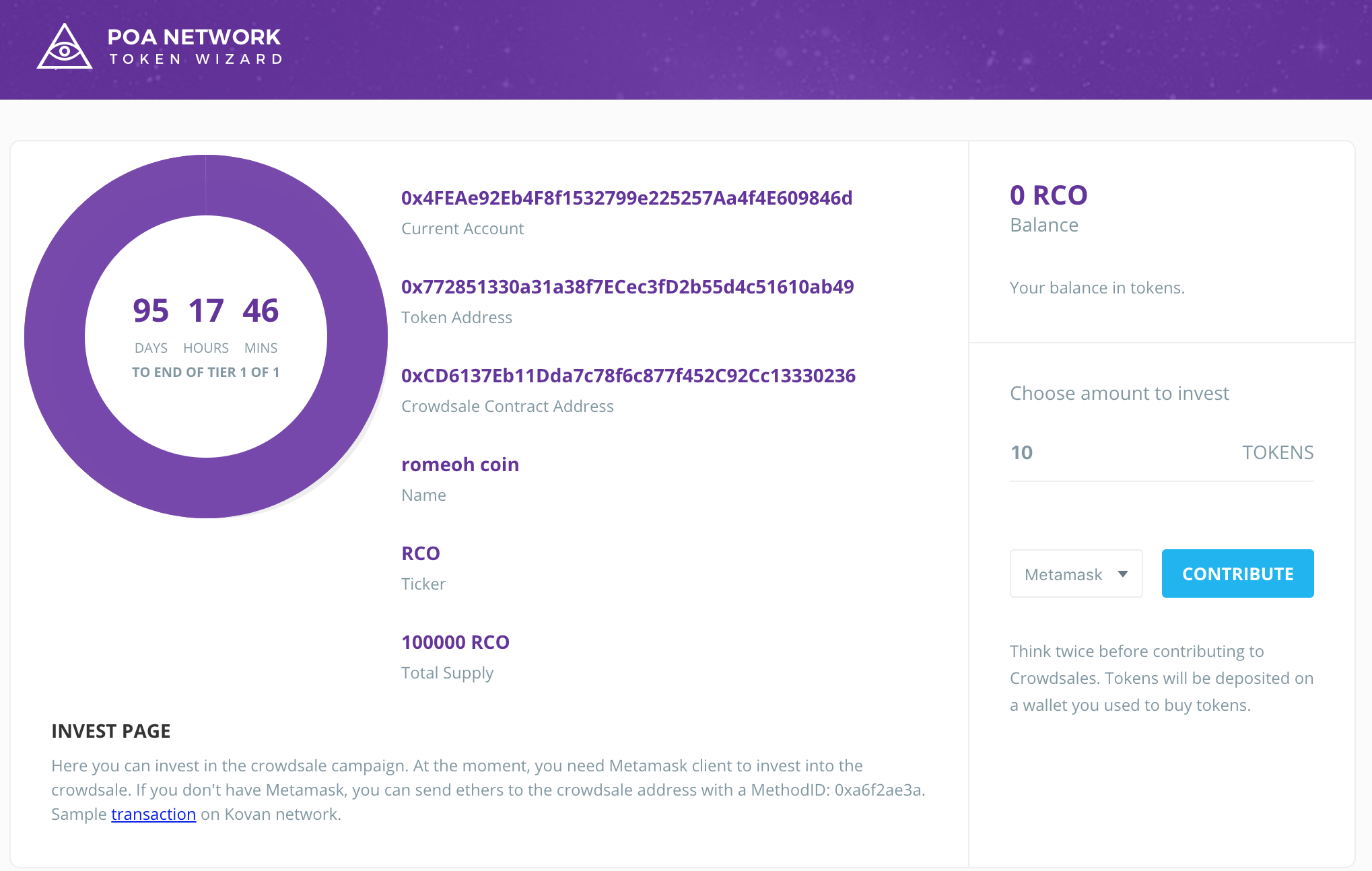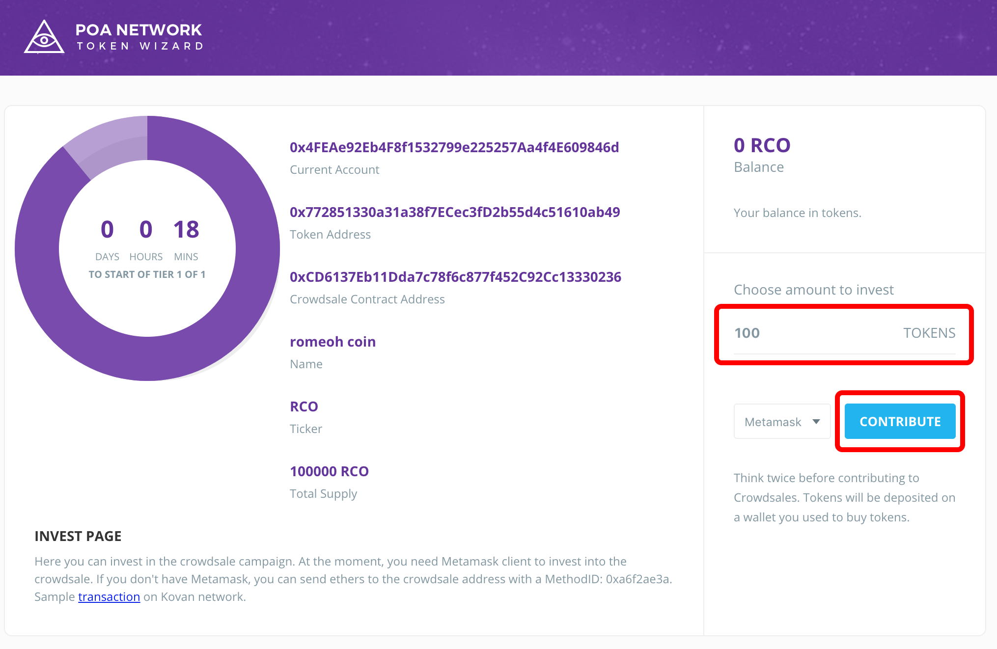 구매자에게 이 페이지를 링크를 주면 token의 갯수를 입력하고 Contribue를 눌러 RCO를 구매하게 됩니다.