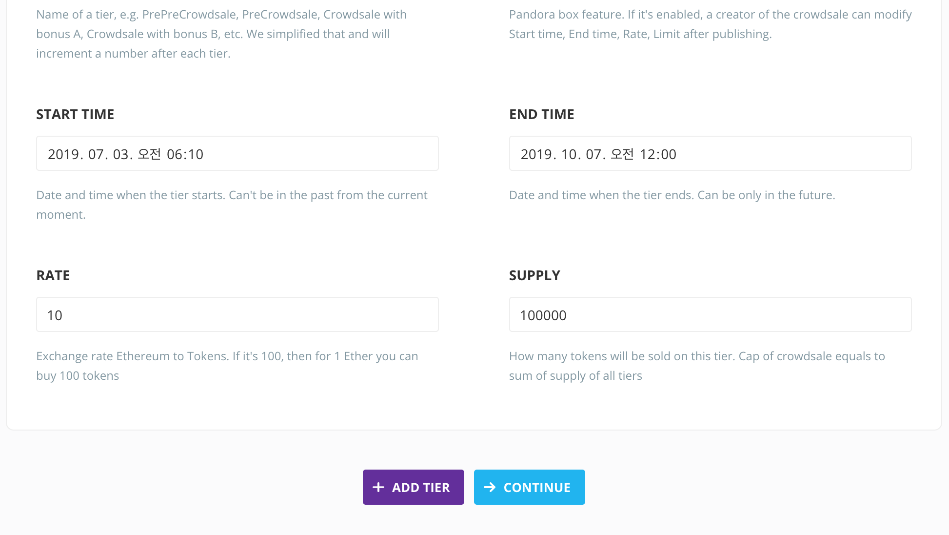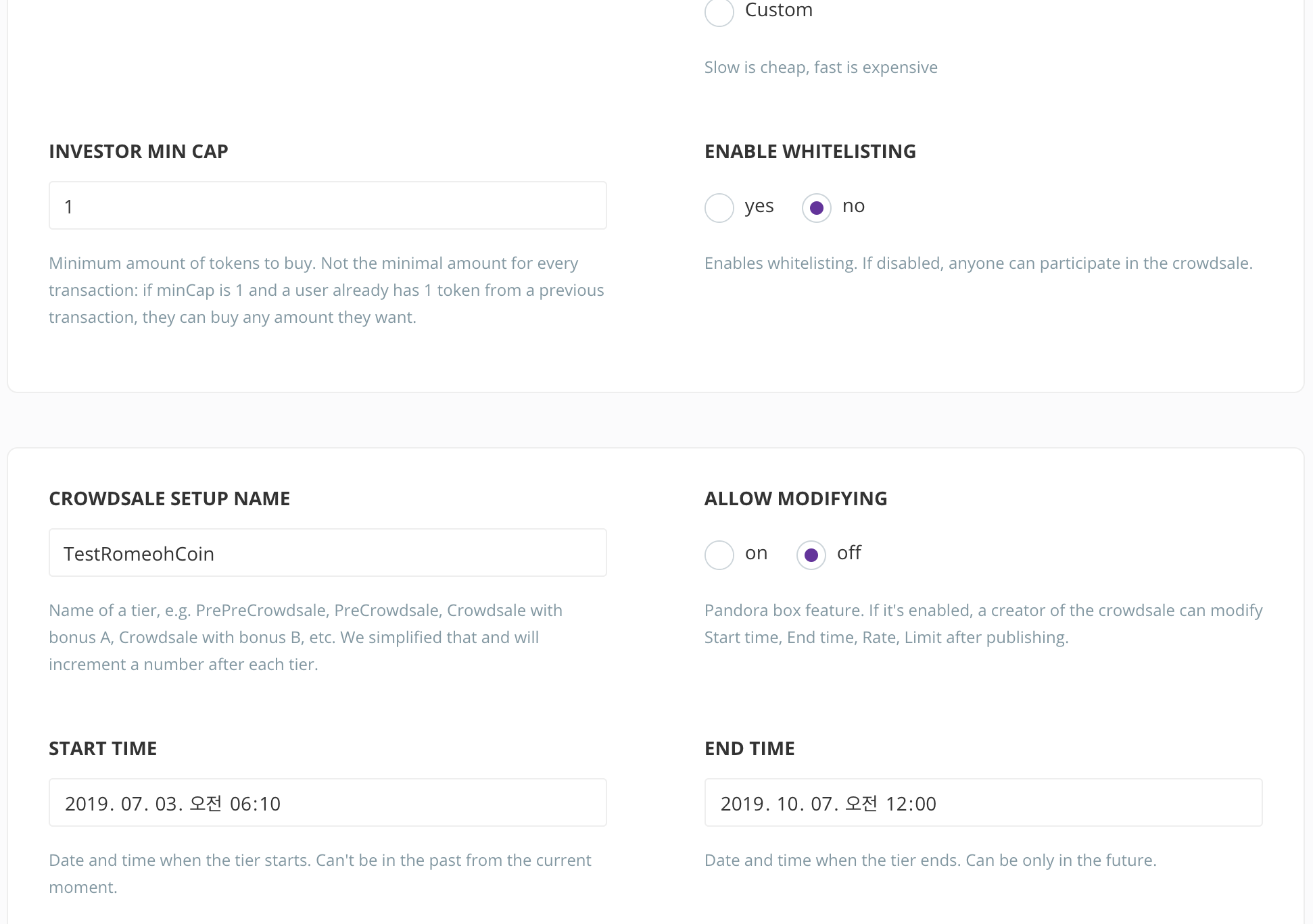 - Crowdsale setup name: ICO 명칭을 입력합니다. ICO를 몇차례 나누어서 진행할 경우 차수별로 명칭을 부여할 수 있습니다.