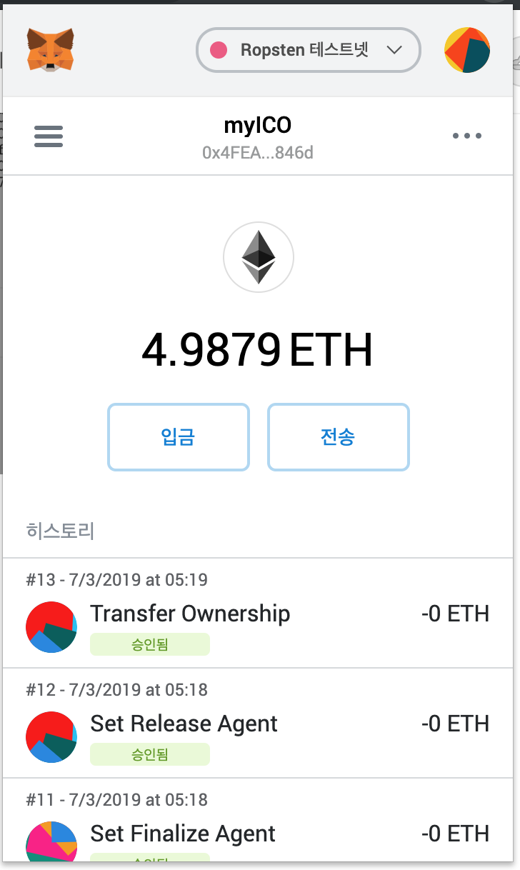 지갑을 열어보면 히스토리에 계약서 승인을 확인 할 수 있습니다.