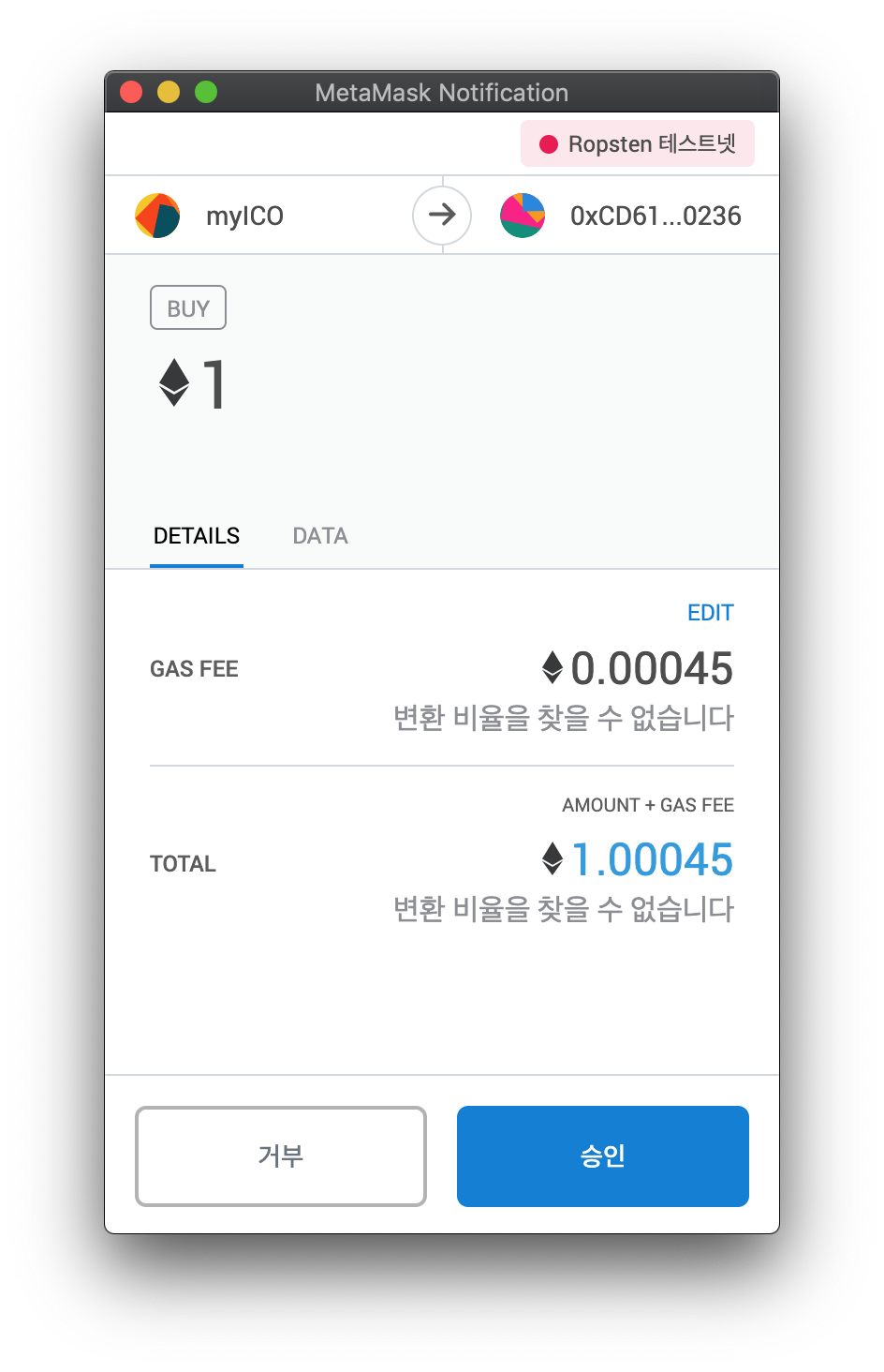 1 ETH를 확인하고 승인을 누릅니다.