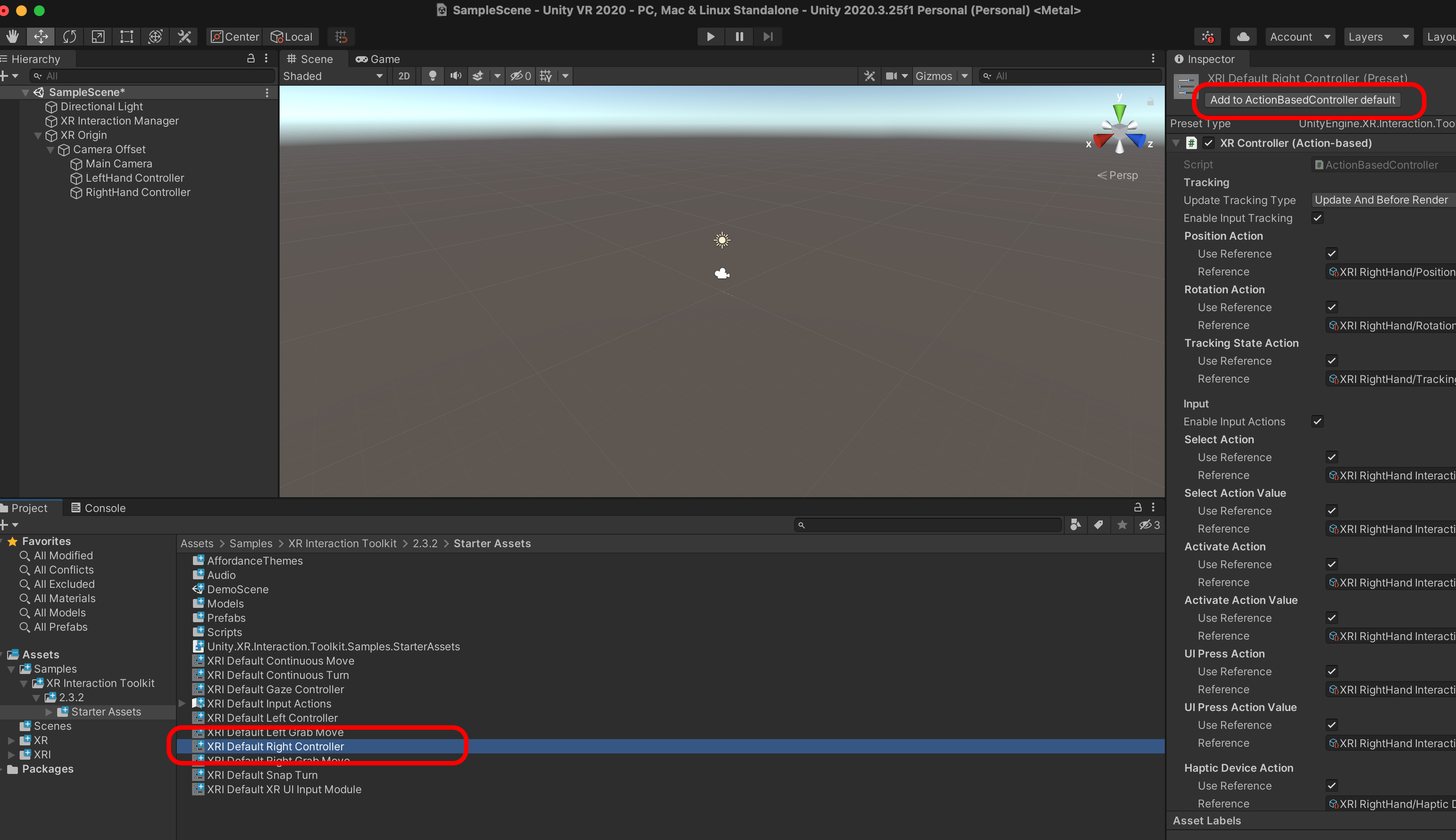XRI Default Right Controller를 선택하고 Add to ActionBaseedController Default를 클릭합니다.