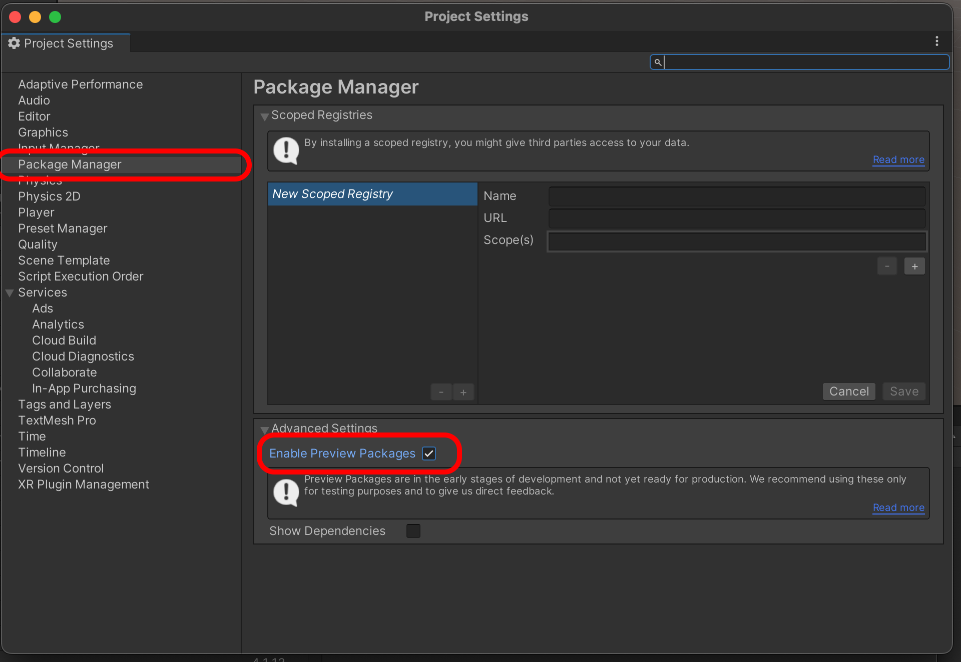 Package Manager에서 Enable Preview Package를 선택합니다.'