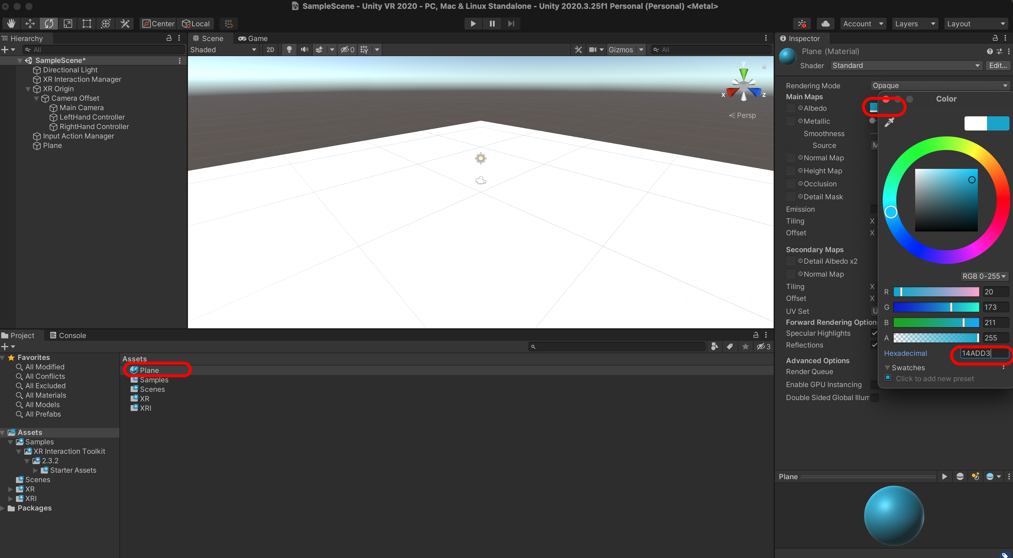 이름을 Plane으로 변경하고 색상을 변경합니다.