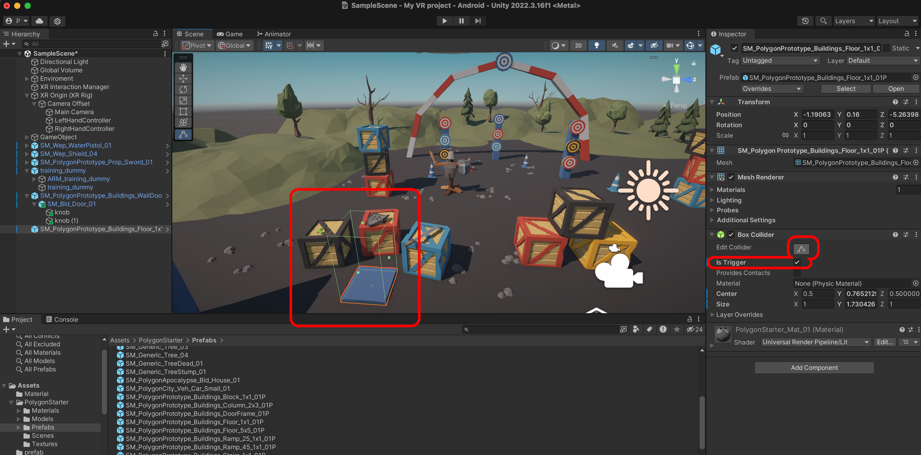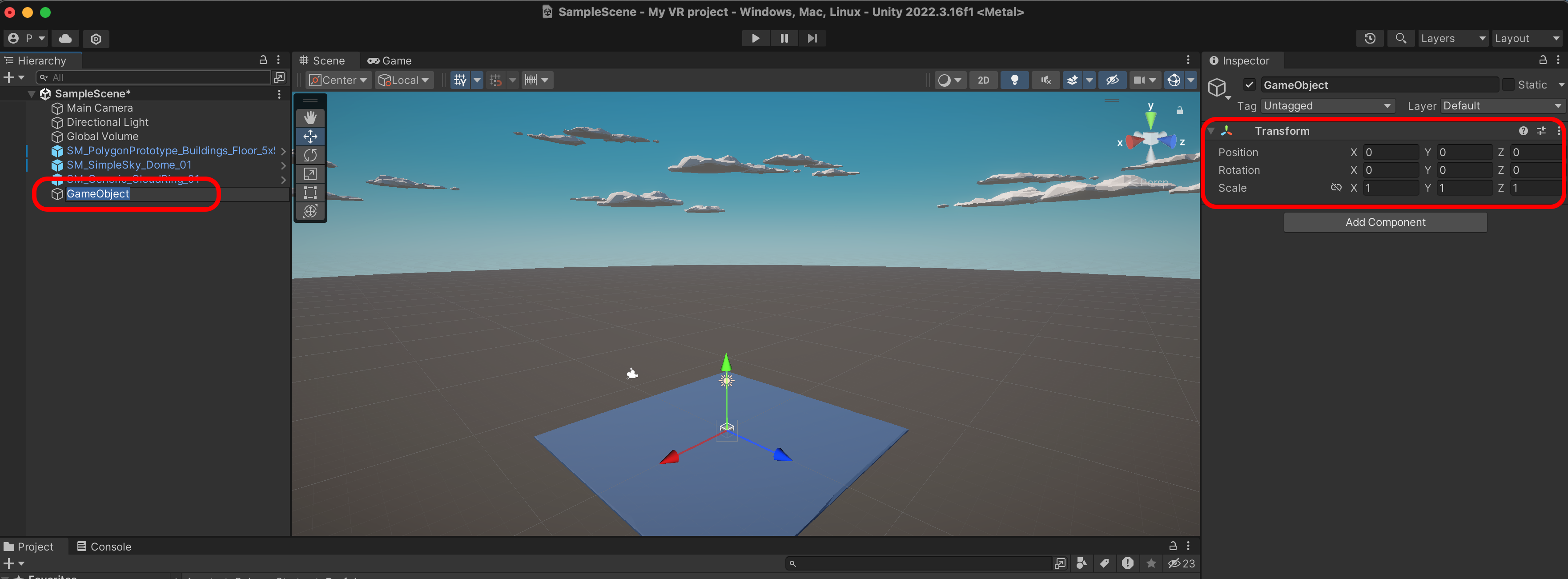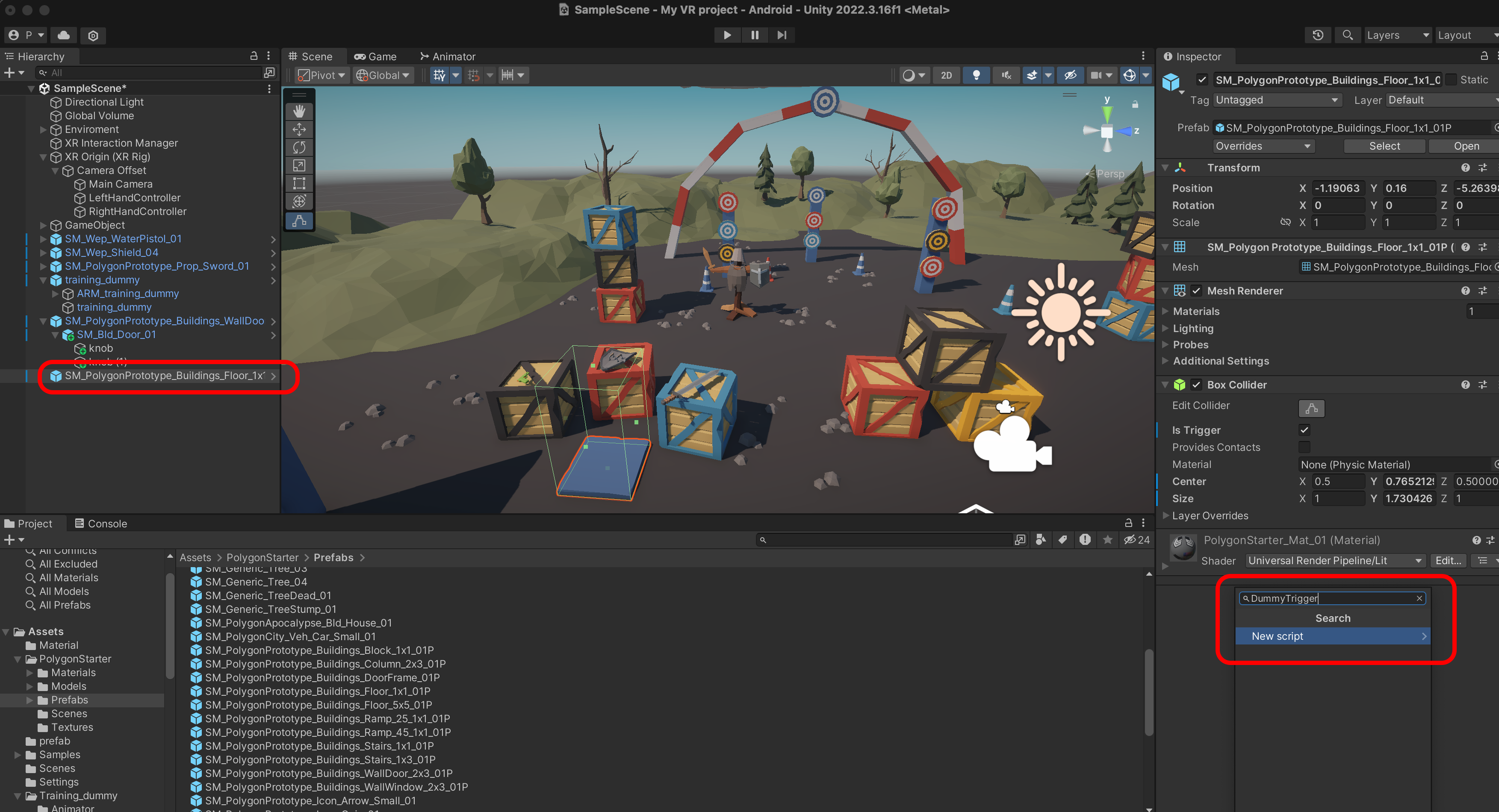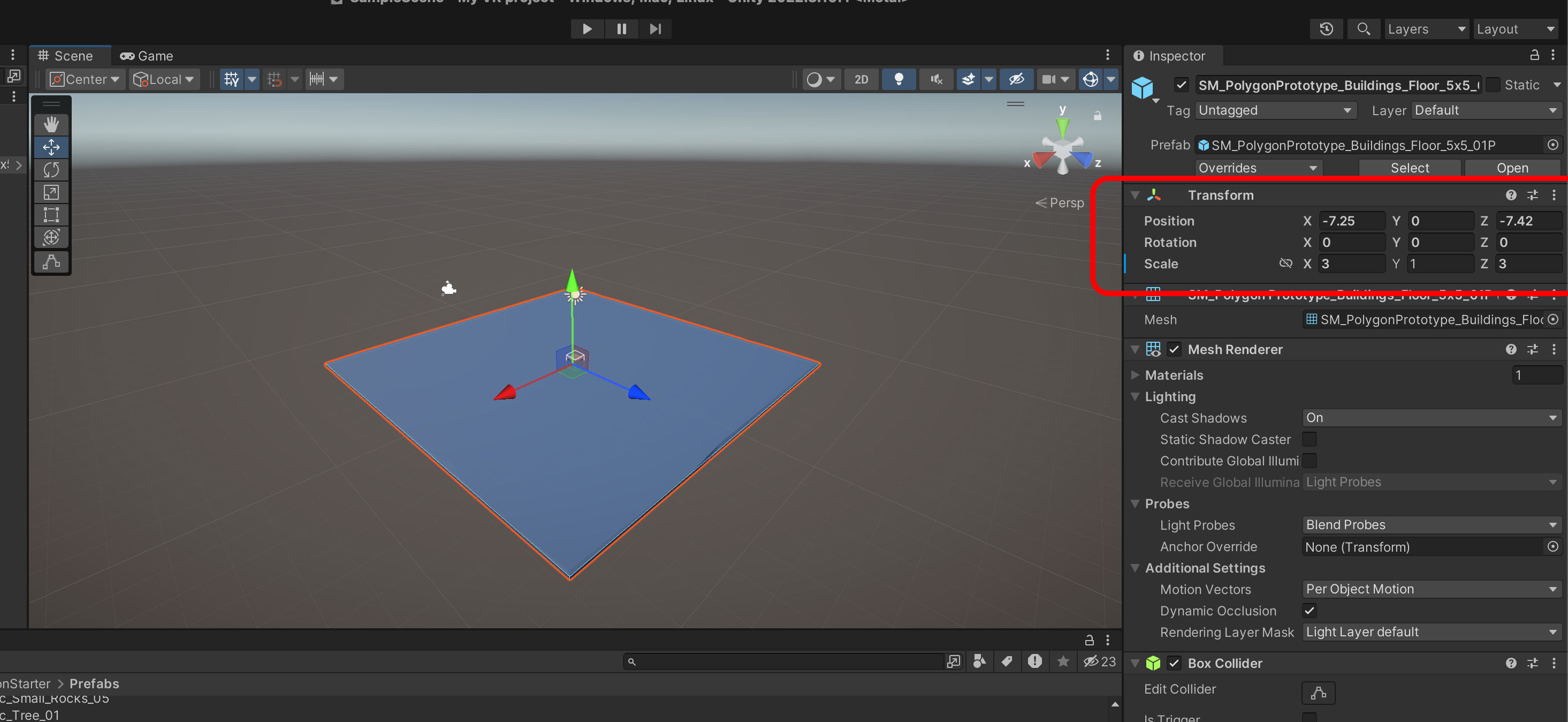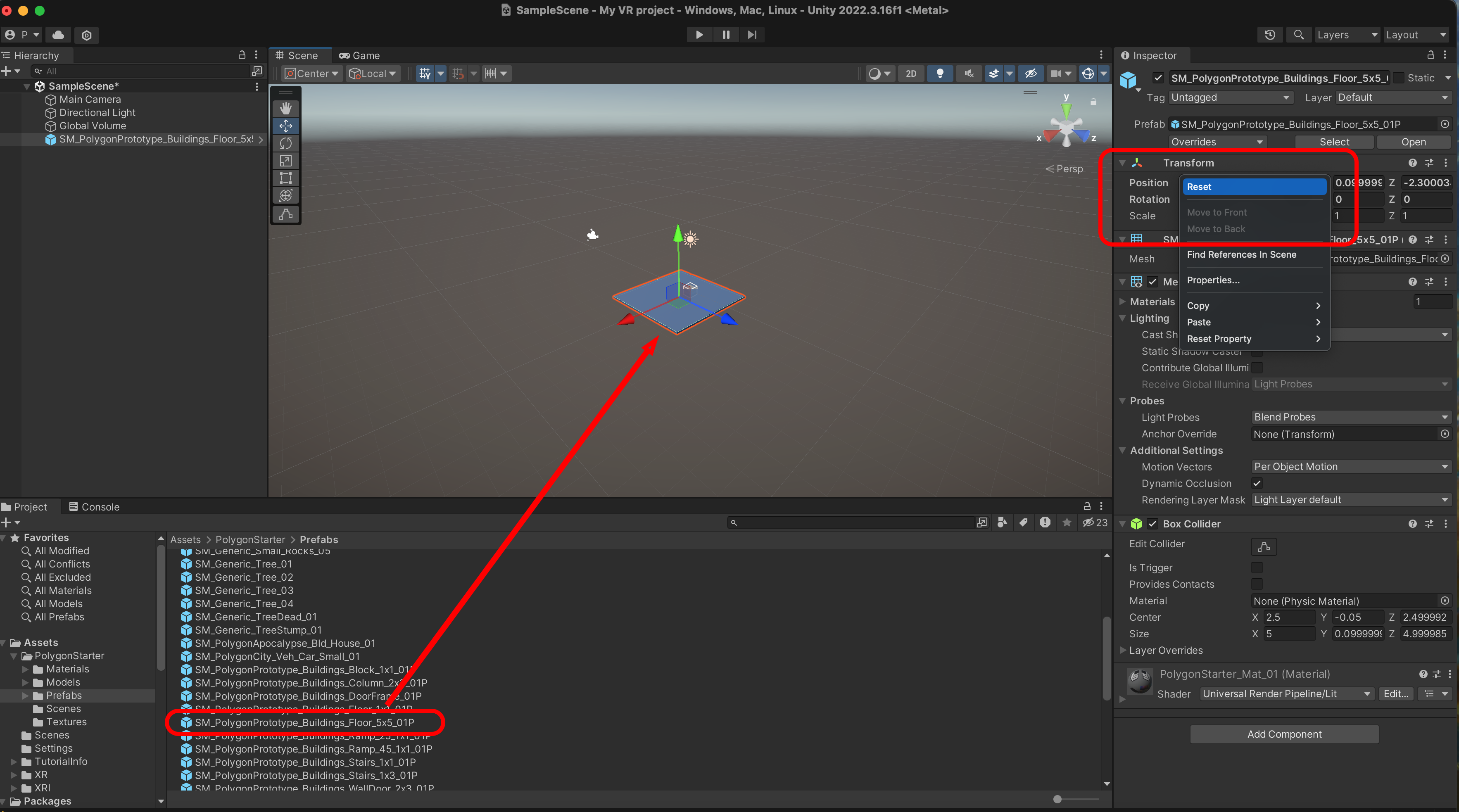 SM_PolygonPrototype_Buildings_Floor_5x5_01P를 Scene에 추가하고 Transform을 Reset 합니다.