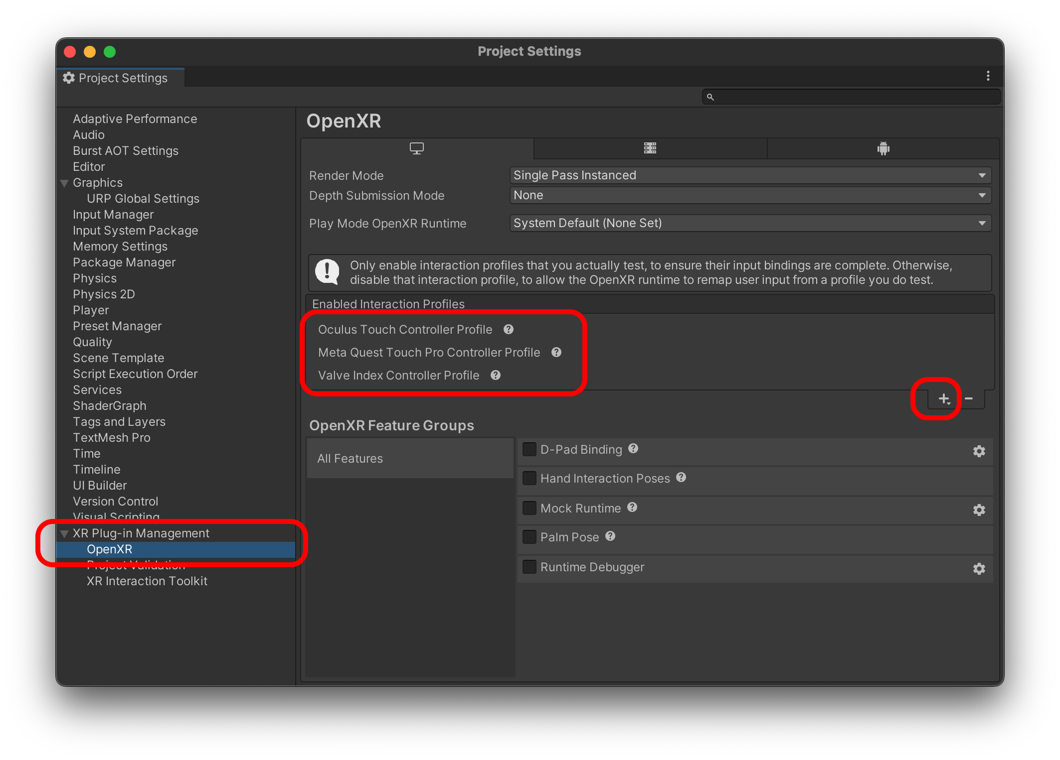 OpenXR에서 +를 눌러서 프로파일을 추가합니다.