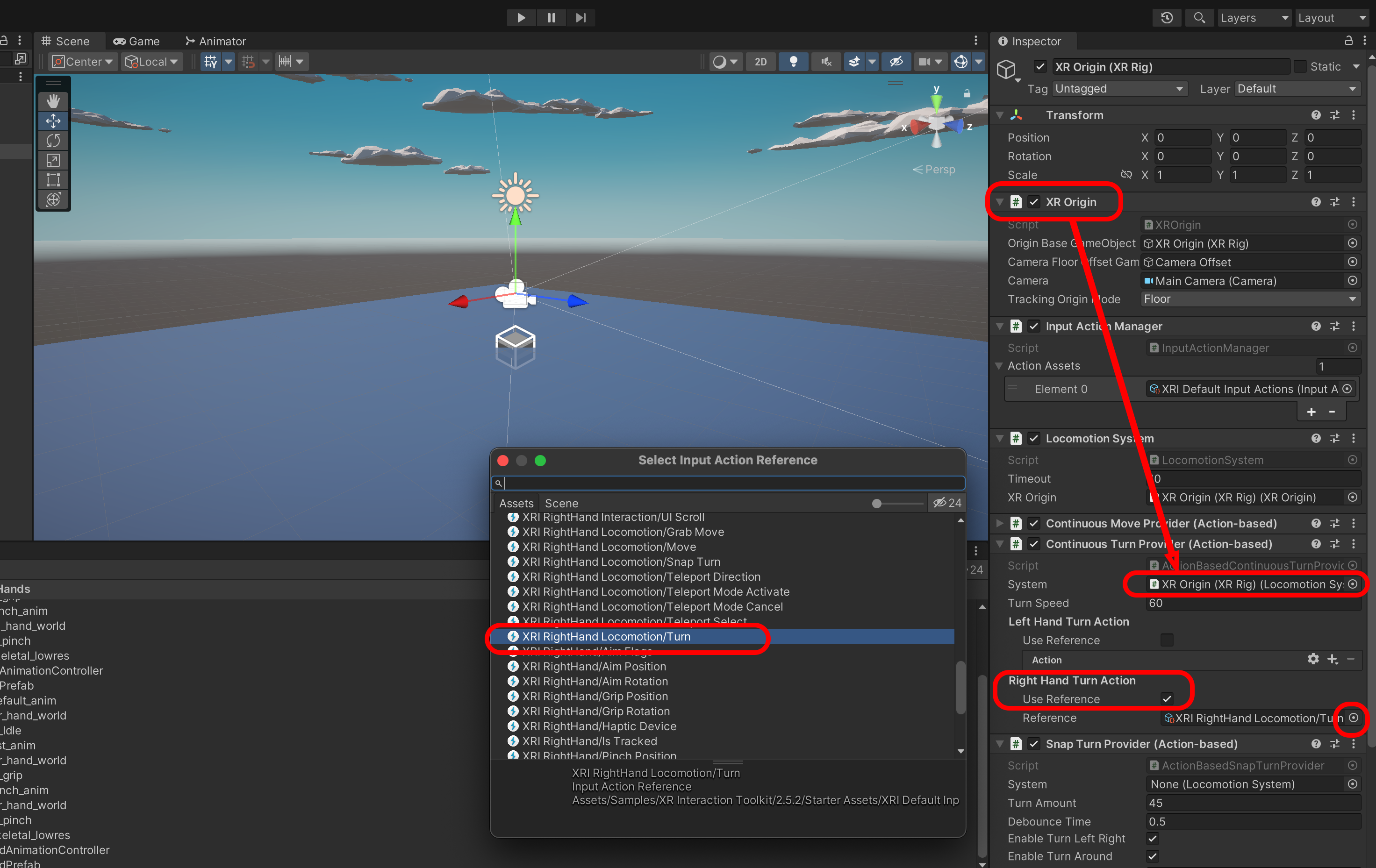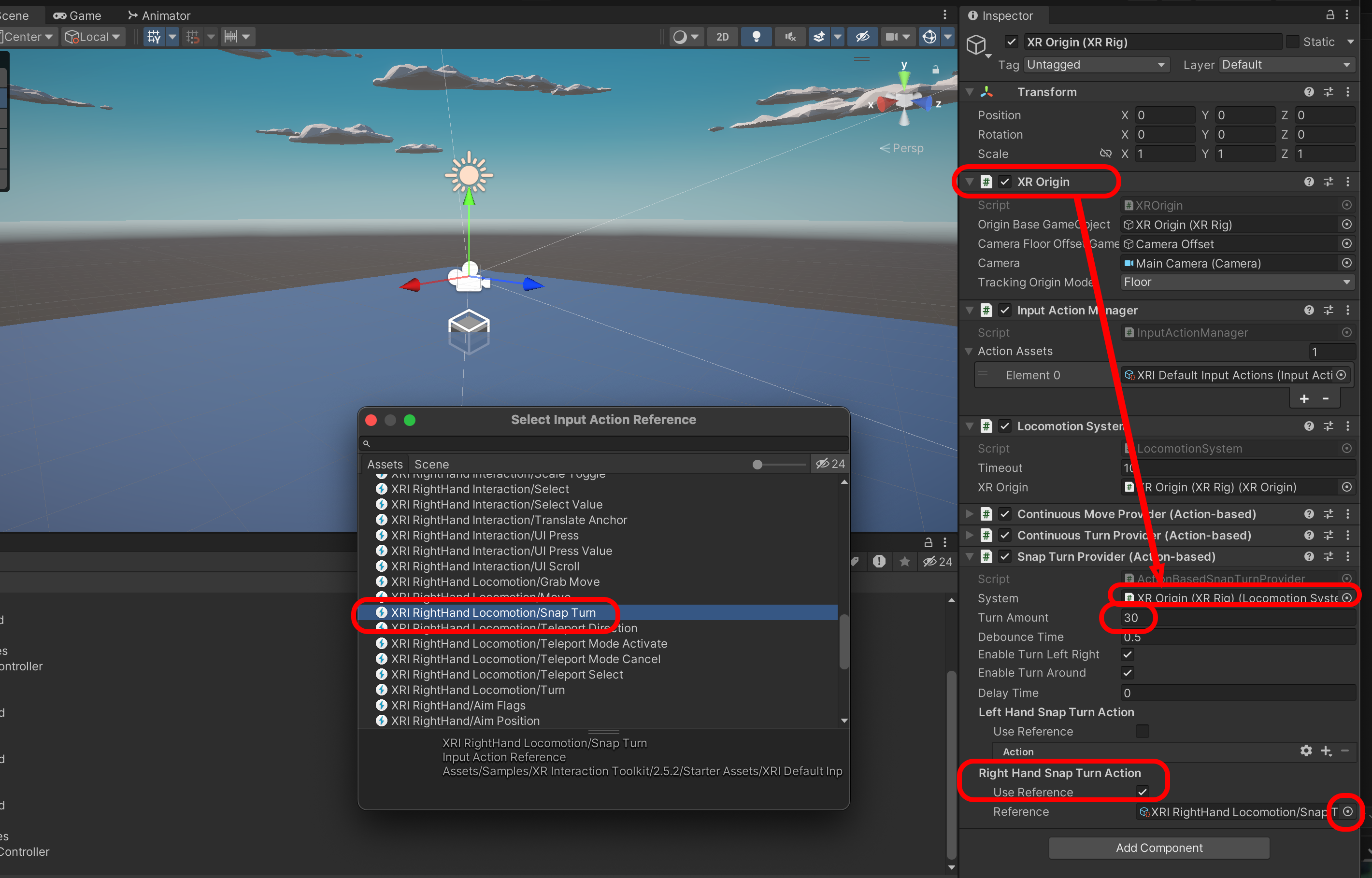 Snap Turn과 Continous Turn을 XR Origin으로 각 연결합니다.