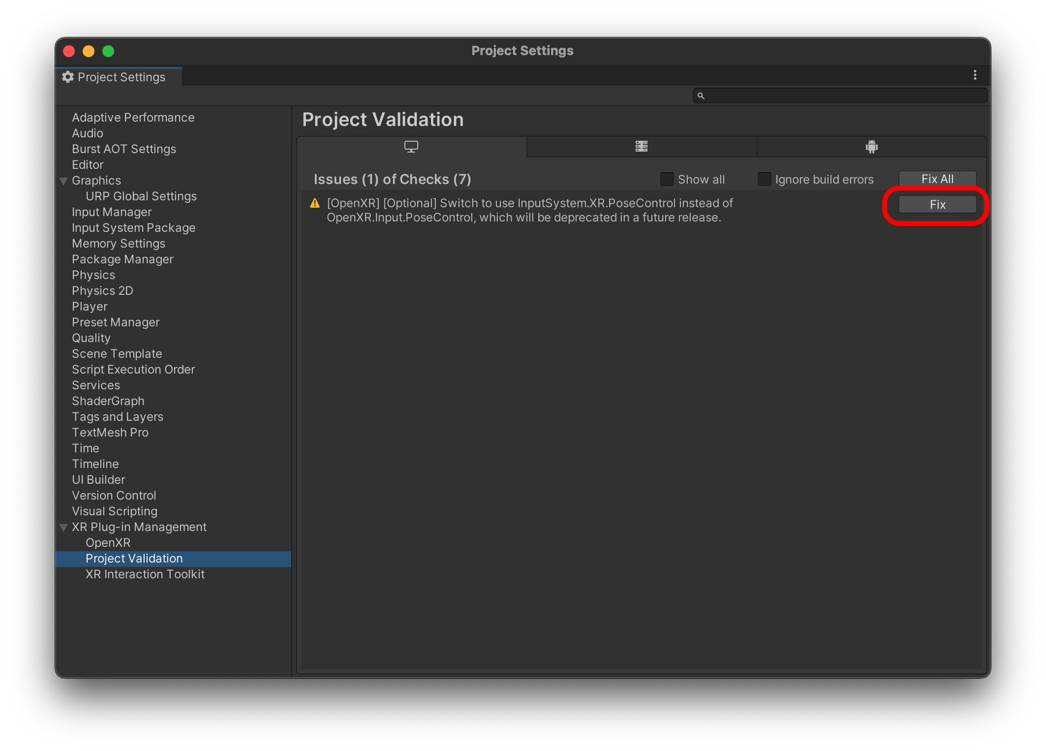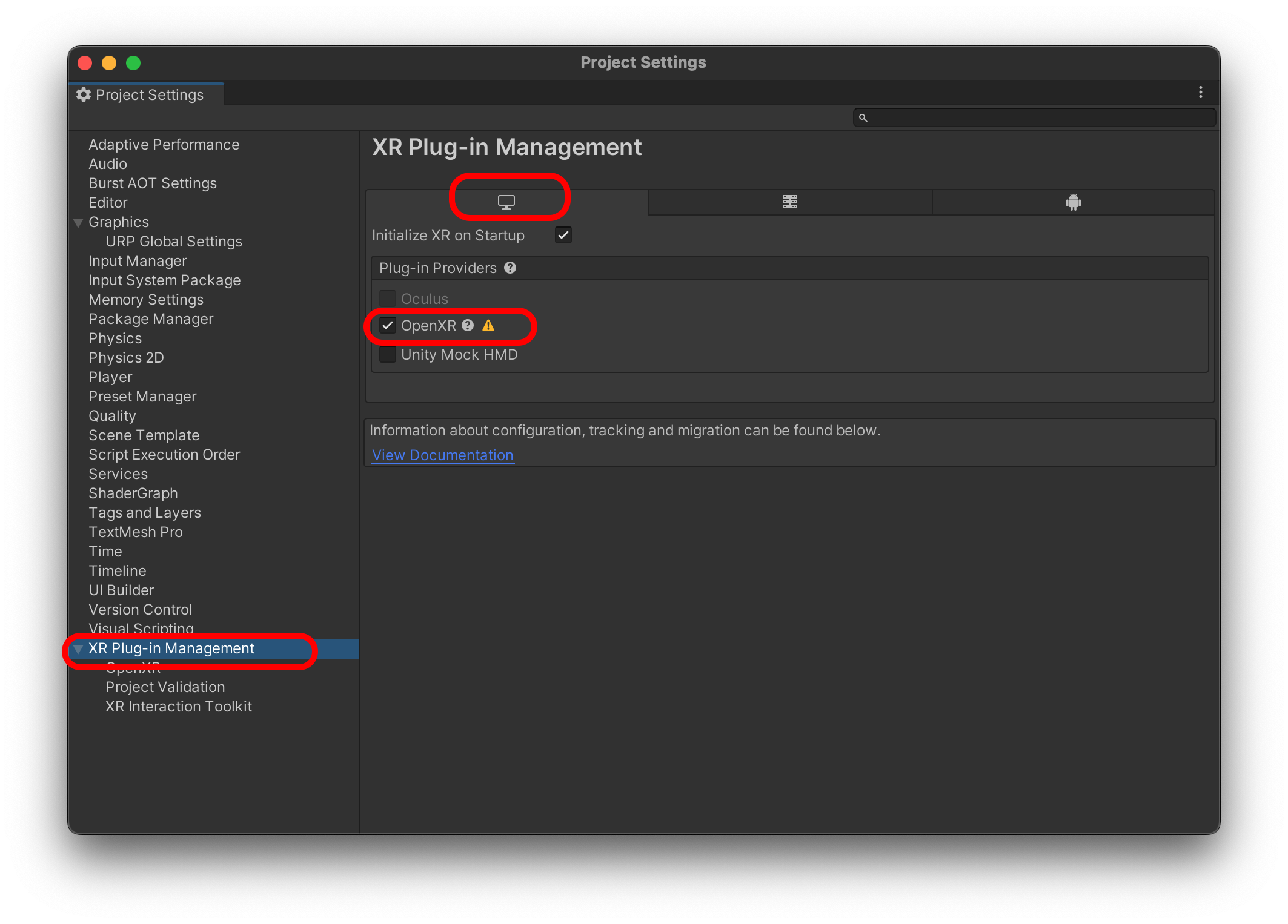 Project Settings > XR Plug-in Management 에서 OpenXR을 체크합니다.