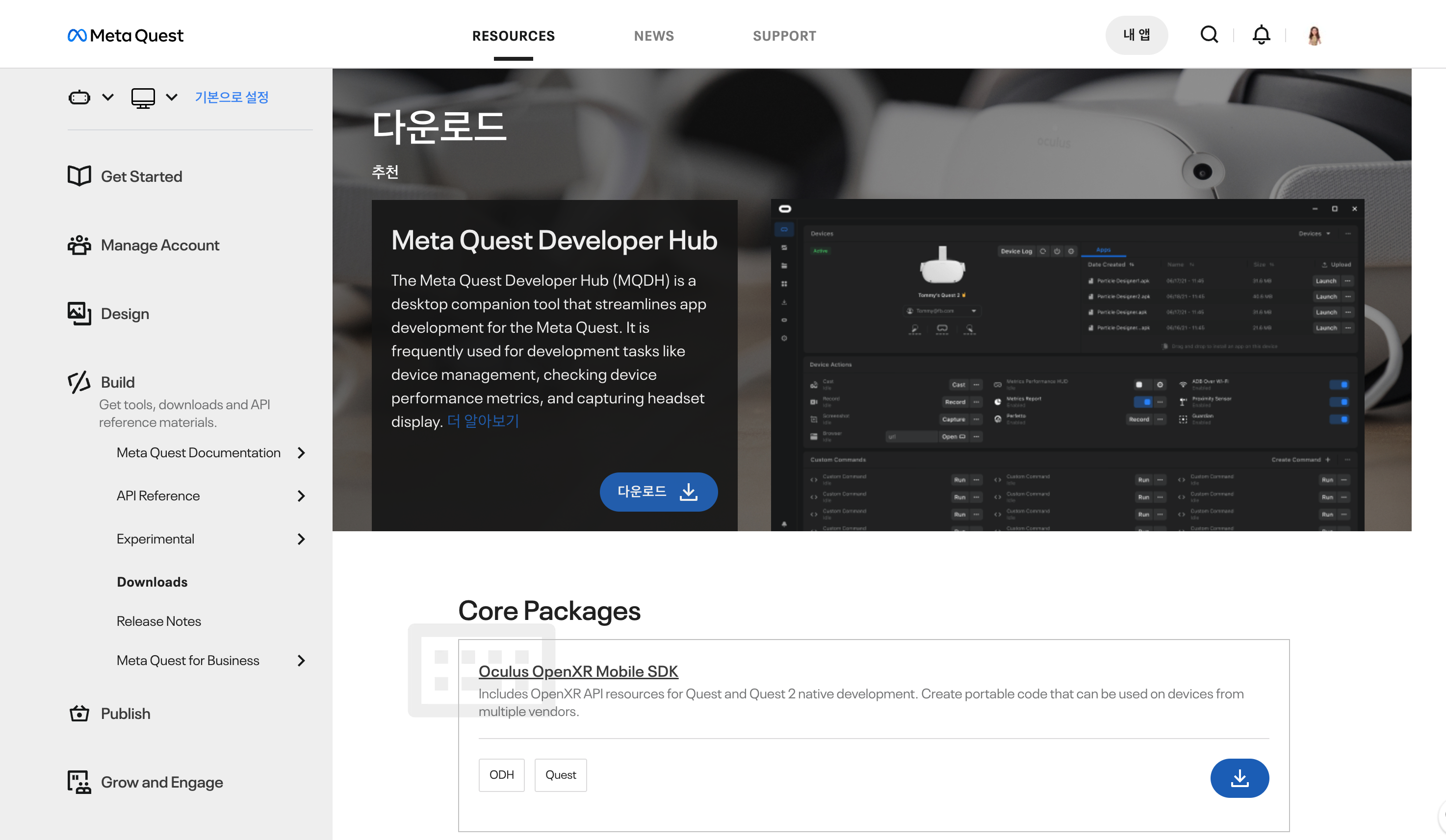 위 사이트에서 Meta Quest Developer Hub를 다운도르해서 설치합니다.