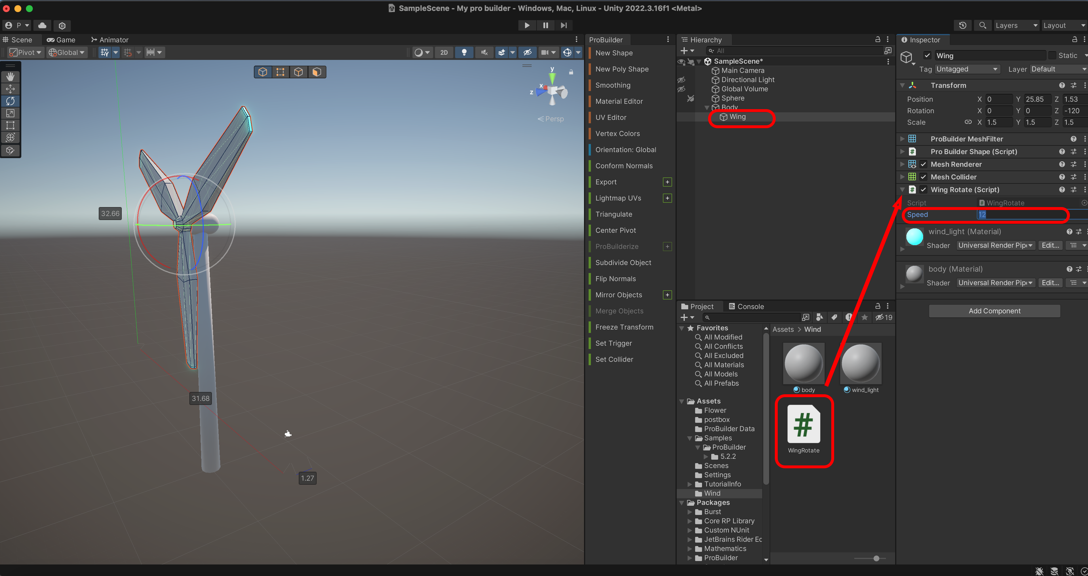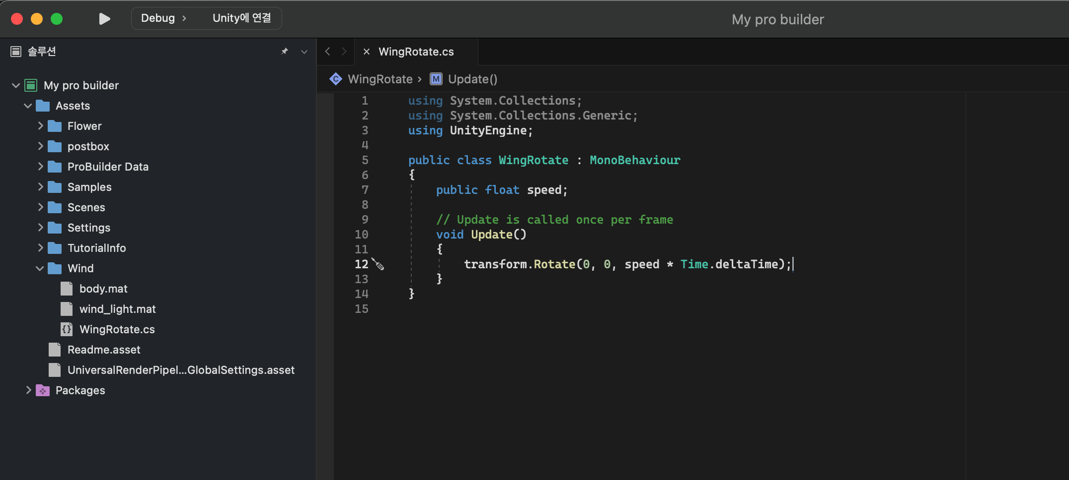 Wing에 WingRotate를 연결하고 Speed를 12로 지정합니다.