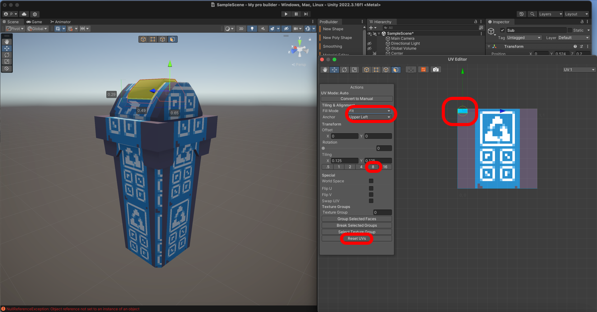 Sub의 모든 면을 선택해서 Convert Auto -> Reset UVs -> Fit -> UpperLeft -> 1/8로 적용합니다.